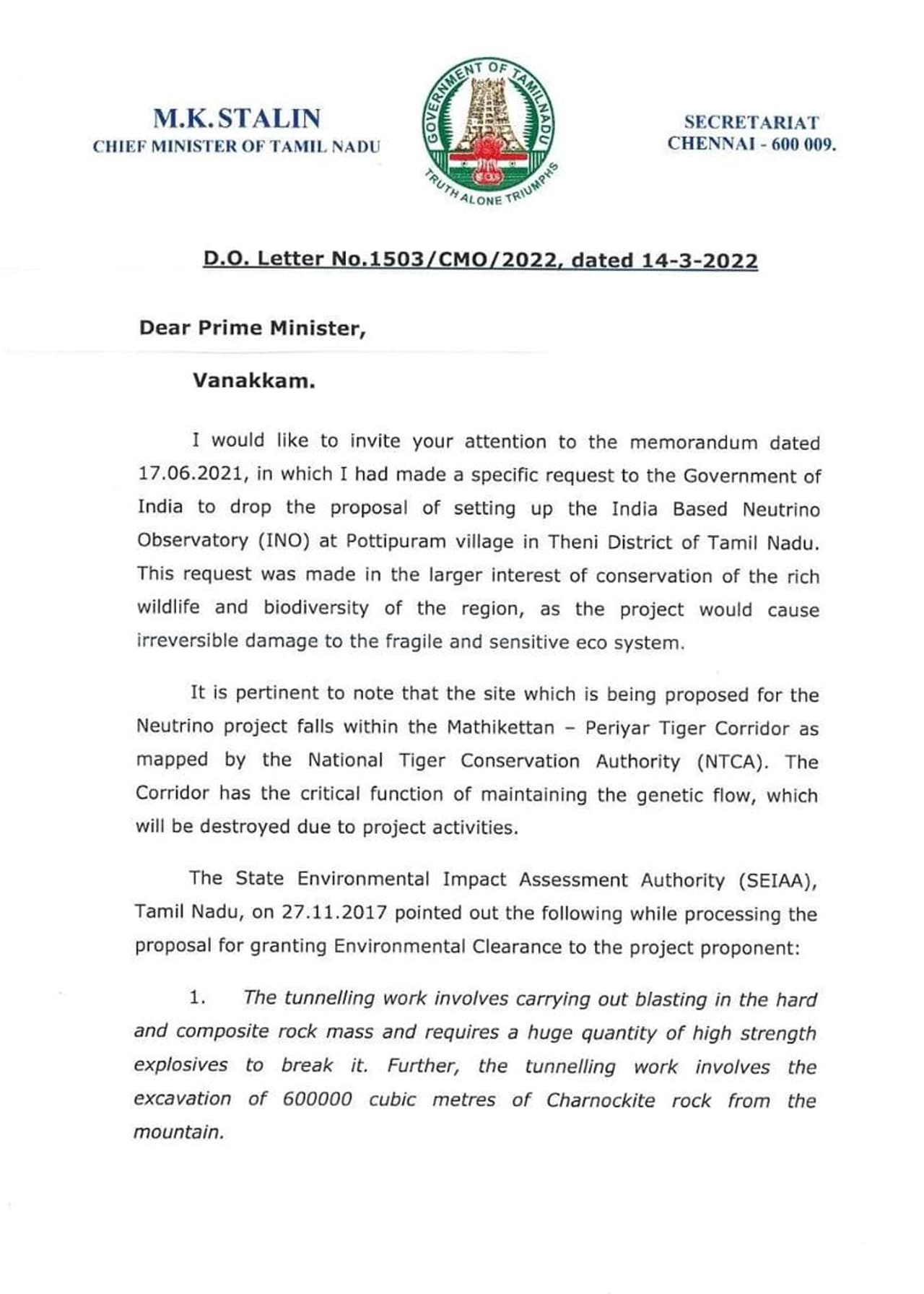 இந்நிலையில், தமிழக முதலமைச்சர் மு.க.ஸ்டாலின் பிரதமர் நரேந்திர மோடிக்கு கடிதம் எழுதியுள்ளார். அக்கடிதத்தில், தேனி மாவட்டம் பொட்டிபுரம் கிராமத்தில் நியூட்ரினோ ஆய்வகம் அமைக்கக் கூடாது. நியூட்ரினோ ஆய்வகம் அமைக்கும் திட்டத்தை மத்திய அரசு கைவிட வேண்டும். நியூட்ரினோ ஆய்வகம் அமைக்கும் திட்டத்தால் தேனி மாவட்டத்தில் சுற்றுச்சூழலுக்கு பாதிப்பு ஏற்படும் என தெரிவிக்கப்பட்டுள்ளது.
