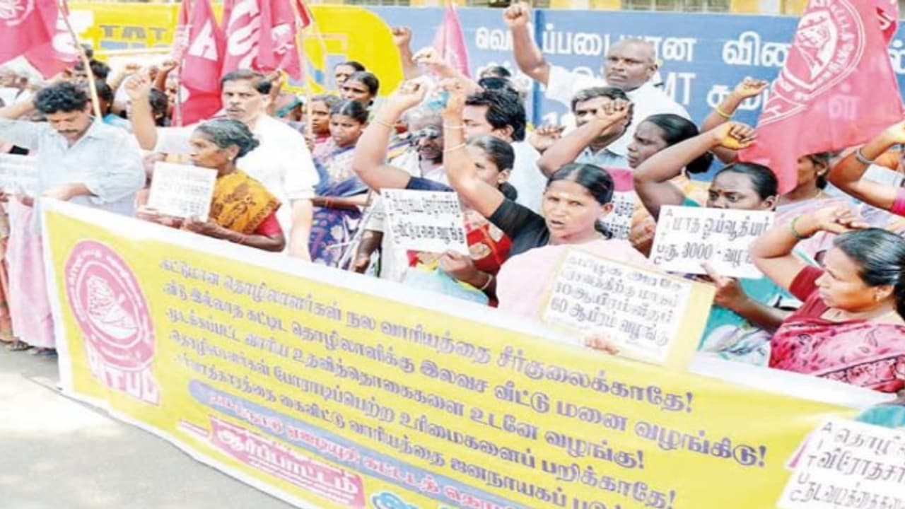 இந்த ஆர்ப்பாட்டத்திற்கு தமிழ்நாடு ஏ.ஐ.டி.யூ.சி. கட்டிடத் தொழிலாளர் சங்க மாவட்ட துணைச் செயலாளர் முருகன் தலைமை வகித்தார்.
