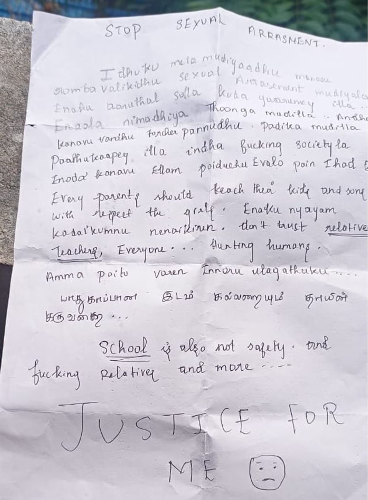 அந்த வகையில் சென்னையை அடுத்த மாங்காட்டில் பாலியல் தொல்லை காரணமாக 11 ஆம் வகுப்பு மாணவி தூக்கிட்டு தற்கொலை செய்து கொண்டுள்ளார். மேலும் அவர் ஒரு உருக்கமான கடிதம் ஒன்றையும் அவர் எழுதியுள்ளார். அதில், பாதுகாப்பான இடம் கல்லறையும் தாயின் கருவறை மட்டுமே என குறிப்பிட்டுள்ளார். மேலும், மாணவி, #SchoolisNotSafety என்றும் கடிதத்தில் தெரிவித்துள்ளார். தற்கொலை செய்து கொண்ட மாணவி, அரசு பெண்கள் மேல்நிலைப் பள்ளியில் 11 ஆம் வகுப்பு படித்து வந்தார். இன்று காலை வழக்கம்போல் அவரது தந்தை வேலைக்கு சென்று விட்டார். அவரது தாய் மற்றும் மகள் மட்டும் வீட்டில் இருந்தனர். தாய் கடைக்கு சென்று விட்டு திரும்பி வந்து பார்த்த போது அறைக்குள் சென்ற மாணவி நீண்ட நேரமாகியும் வெளியே வரவில்லை. கதவை தட்டியும் திறக்காததால் அக்கம், பக்கத்தினர் உதவியுடன் கதவை உடைத்து உள்ளே சென்று பார்த்தபோது மாணவி தூக்கு மாட்டி தற்கொலை செய்து கொண்டு இறந்த நிலையில் இருப்பதை கண்டு அதிர்ச்சி அடைந்தனர். இதுகுறித்து மாங்காடு போலீசாருக்கு தகவல் தெரிவிக்கப்பட்டது.
