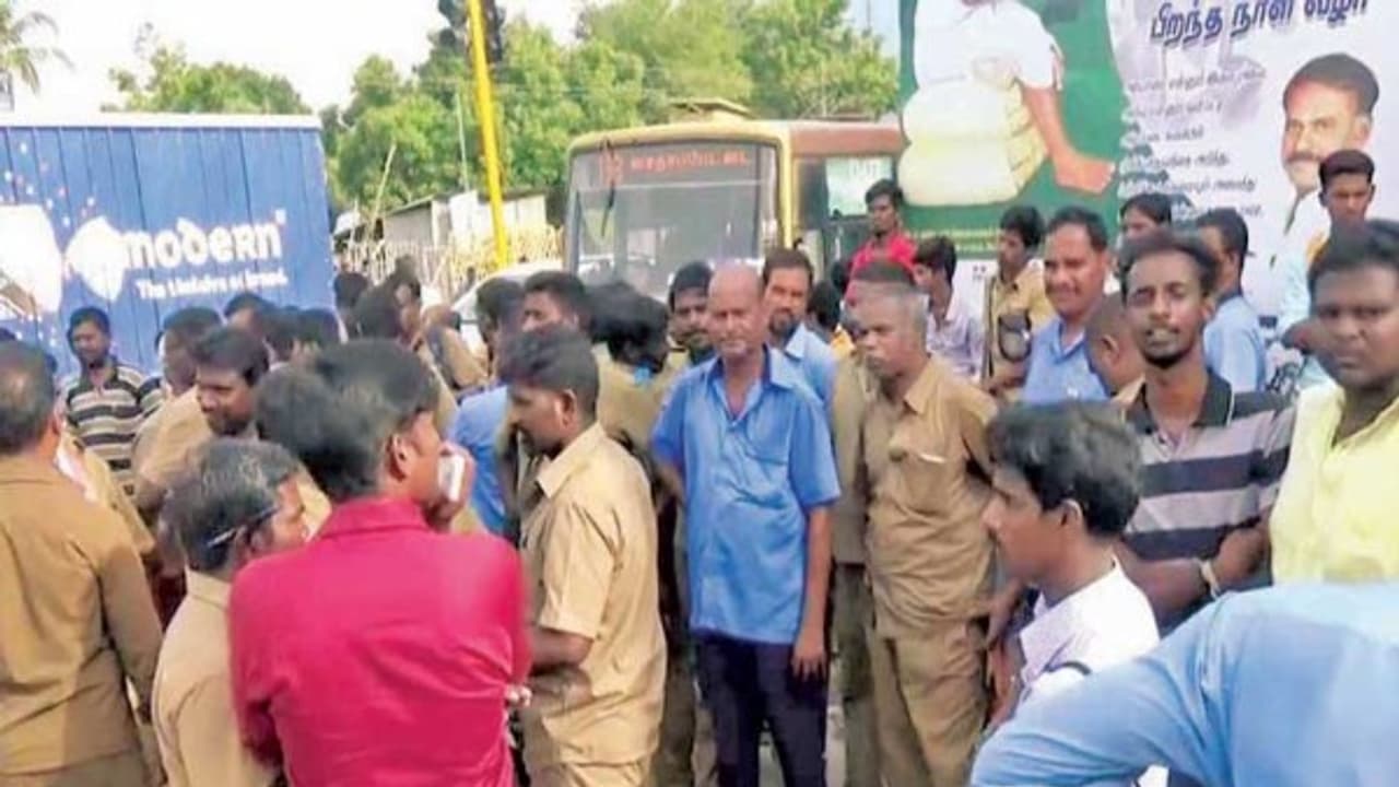 கேளம்பாக்கத்தில் மாநகர பேருந்து ஓட்டுநரை தாக்கியவரை கைது செய்யக்கோரி பேருந்துகளை நடுவழியில் நிறுத்திப் போக்குவரத்து ஊழியர்கள் போராட்டத்தில் ஈடுபட்டனர்.
