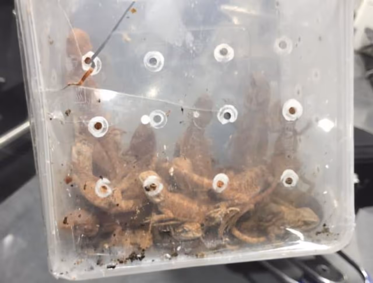 சிங்கப்பூரில் இருந்து விமானம் மூலம் கோவைக்கு அரிய வகை பாம்புகள், ஓணான் உள்ளிட்ட உயிர் இனங்களை கடத்தி வந்த இரண்டு பேரை பிடித்து போலீஸார் விசாரணை மேற்கொண்டு வருகின்றனர்