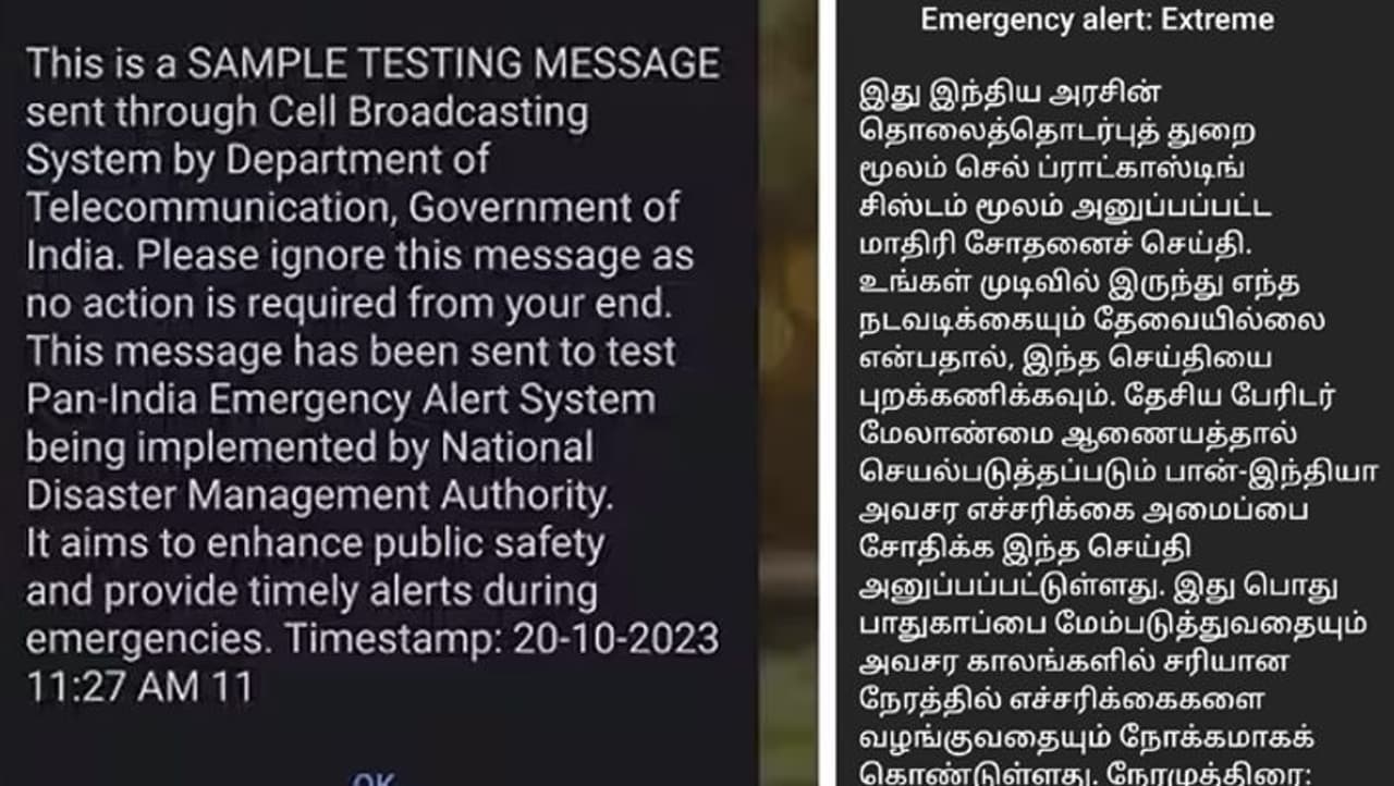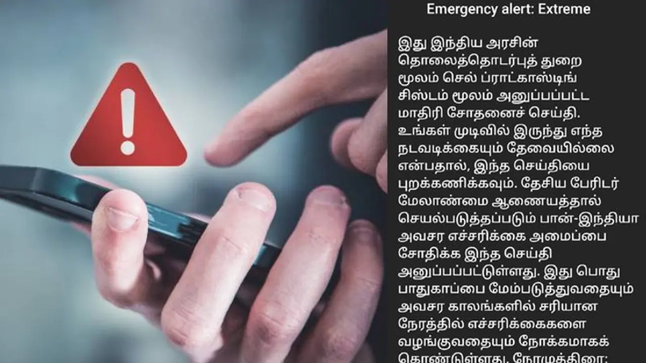 முதலில் ஆங்கிலத்தில் அனுப்பப்பட்ட நிலையில் தொடர்ந்து தமிழில் அனுப்பப்பட்டது. அதில், இது இந்திய அரசின் தொலைத்தொடர்புத் துறை மூலம் செல் ப்ராட்காஸ்டிங் சிஸ்டம் மூலம் அனுப்பப்பட்ட மாதிரி சோதனைச் செய்தி. உங்கள் முடிவில் இருந்து எந்த நடவடிக்கையும் தேவையில்லை என்பதால், இந்த செய்தியை புறக்கணிக்கவும் தேசிய பேரிடர் மேலாண்மை ஆணையத்தால் செயல்படுத்தப்படும் பான்-இந்தியா அவசர எச்சரிக்கை அமைப்பை சோதிக்க இந்த செய்தி அனுப்பப்பட்டுள்ளது. இது பொது பாதுகாப்பை மேம்படுத்துவதையும் அவசர காலங்களில் சரியான நேரத்தில் எச்சரிக்கைகளை வழங்குவதையும் நோக்கமாகக் கொண்டுள்ளது என்று தெரிவிக்கப்பட்டுள்ளது.