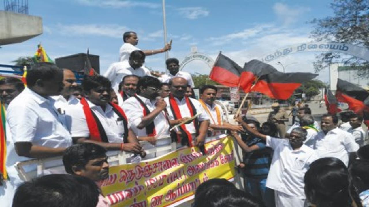 Demonstration on behalf of all party parties to set up entrance bridge at Coimbatore