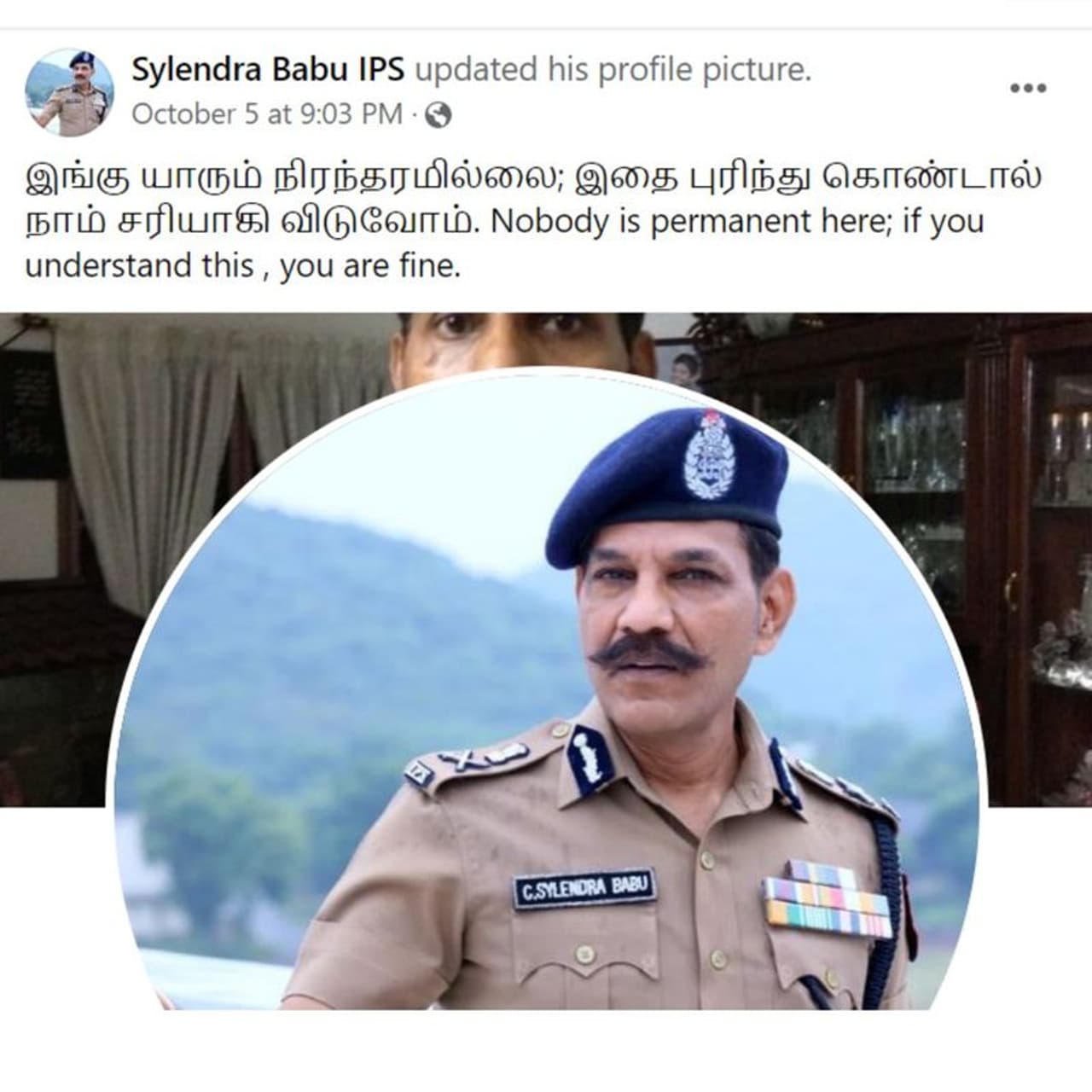 இந்நிலையில் டிஜிபி சைலேந்திர பாபு ராஜினாமா செய்ய உள்ளதாக தகவல் வெளியாகி இருக்கிறது. இது எந்த அளவுக்கு உண்மை என்று தெரியவில்லை. அப்படி இருக்கும் போது, டிஜிபி சைலேந்திர பாபுவின் முகநூல் பக்கத்தில் புதிய பதிவு ஒன்றினை வெளியிட்டு இருக்கிறார். அது பெரும் சர்ச்சையை ஏற்படுத்தி இருக்கிறது.