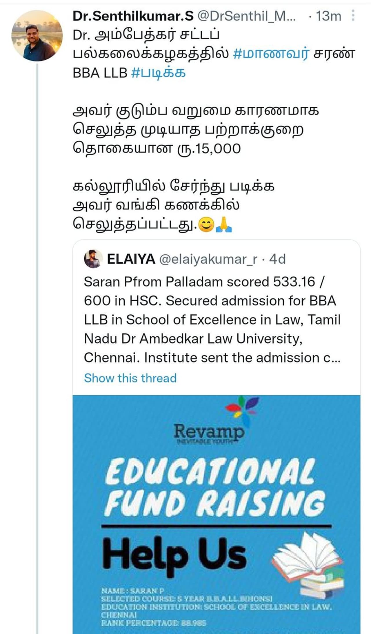 டாக்டர் அம்பேத்கர் சட்டப் பல்கலைக்கழகத்தில் இளநிலை சட்டம் பயின்று வரும் மாணவர் சரண், குடும்ப வறுமையின் காரணமாக கல்வி படிப்பை தொடர முடியாமல் இருக்கிறார்.அவருக்கு உதவுங்கள் என்று ‘ரீவேம்ப்’ (Revamp) எனும் அமைப்பினர் தருமபுரி எம்.பி செந்தில்குமாரை ட்விட்டரில் டேக் செய்து, பதிவிட்டனர்.