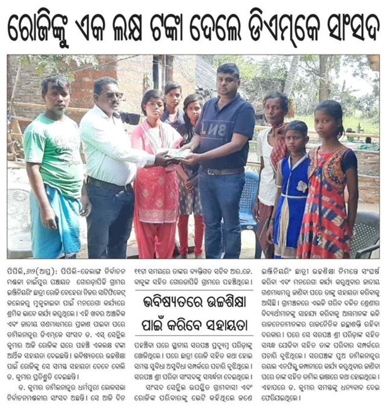 இதனை பார்த்த எம்.பி செந்தில்குமார், உடனே ரூ.15,000 -த்தினை சரண் என்ற அம்மாணவருக்கு அனுப்பி உதவி இருக்கிறார்.தமிழகம் மட்டுமல்ல இந்தியாவில் வேறு எங்கிருந்து உதவி தேவைப்பட்டாலும் சரி, உடனே உதவி செய்கிறார் தருமபுரி திமுக எம்.பி செந்தில்குமார். கடந்த பிப்ரவரி மாதம், மகாத்மா காந்தி ஊரக வேலைவாய்ப்பு திட்டத்தின் கீழ் கூலி வேலை செய்து டிப்ளோ படித்த தனக்கு பிடெக் படிக்க ஆசை என்றும் அதற்கு உதவி செய்வேண்டும் எனவும் ஒடிசா மாநிலத்தைச் சேர்ந்த பட்டியலின மாணவி ருசுபோடா கோரியிருந்தார்.