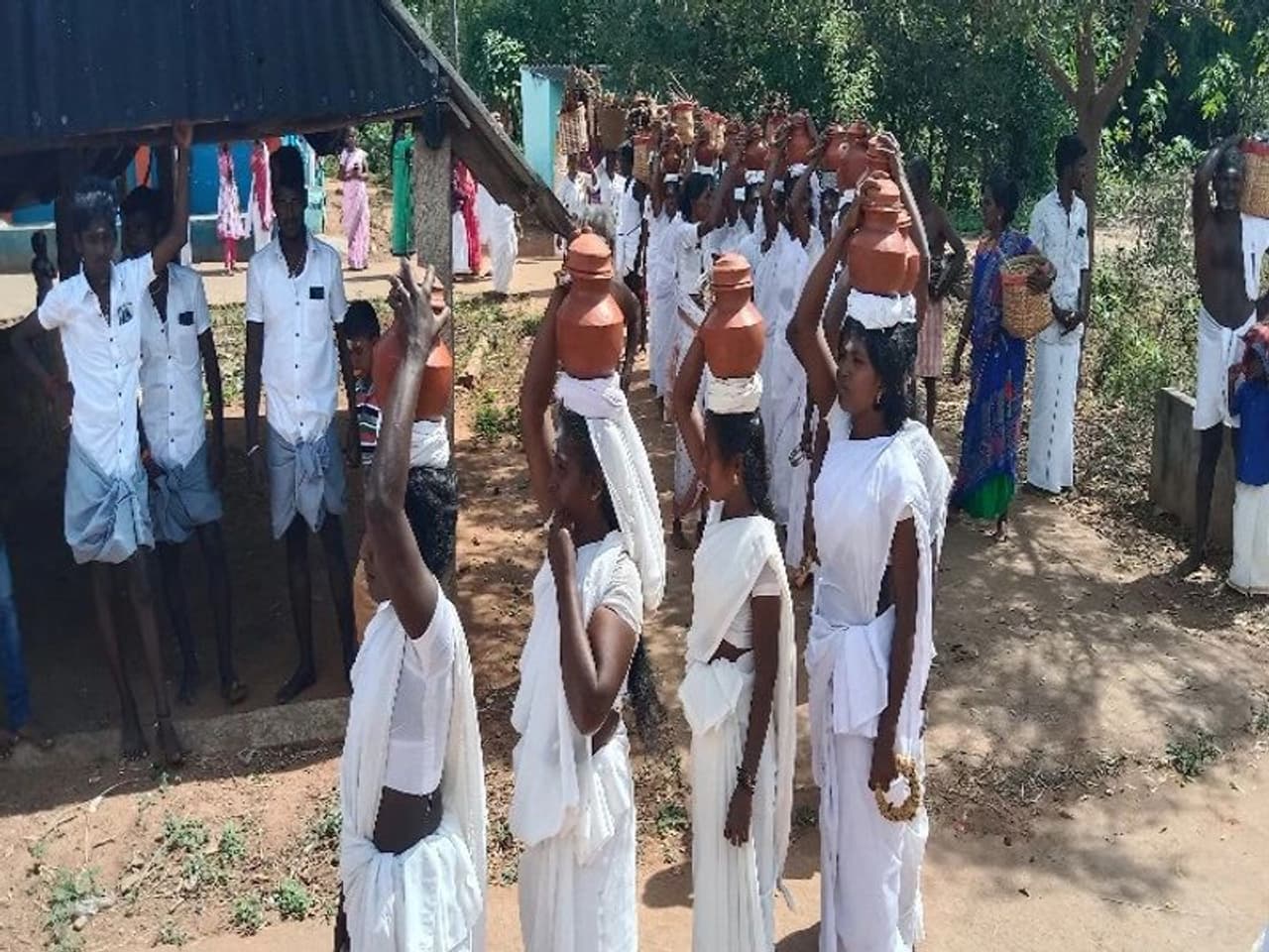 சிவகங்கை அருகே பொங்கல் விழாவில் பெண்கள் வெள்ளை சேலை உடுத்தி பொங்கல் வைத்தனர்.
