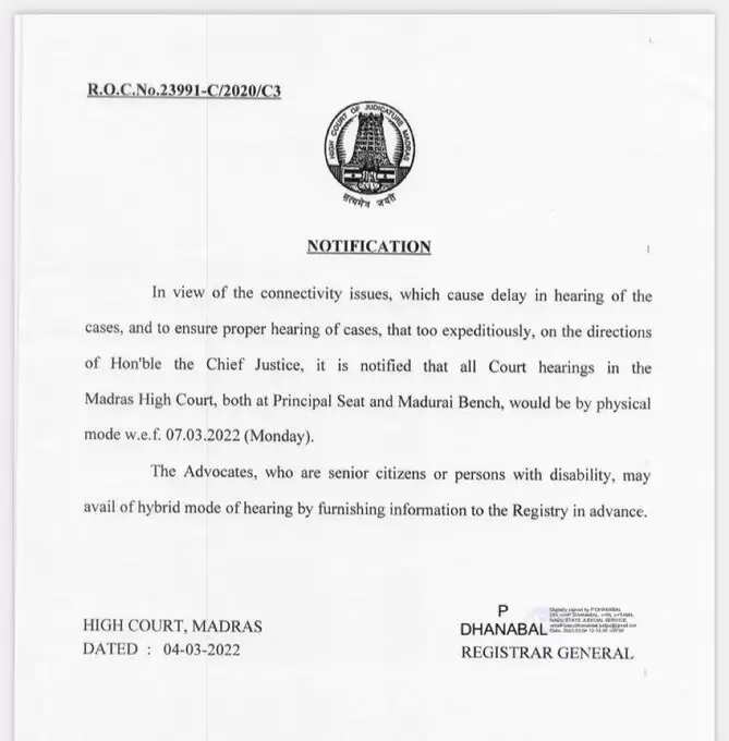 இதை அடுத்து முதலமைச்சர் மு.க.ஸ்டாலின் கொரோனா கட்டுப்பாடுகளில் பல்வேறு தளர்வுகளை அறிவித்தார். அந்த வகையில் தற்போது நீதிமன்றங்களிலும் காணொலி மற்றும் நேரடி விசாரணை என கலப்பு முறையில் முக்கிய வழக்குகள் விசாரிக்கப்பட்டு வந்தன. இந்த நிலையில் தலைமை நீதிபதி முனீஸ்வர் நாத் பண்டாரி வரும் மார்ச் 7 ஆம் தேதி முதல் நேரடி விசாரணை முறையில் வழக்குகள் விசாரிக்கப்படும் என்று அறிவித்தார். அவரை தொடர்ந்து சென்னை உயர் நீதிமன்றம் மற்றும் உயர் நீதிமன்ற மதுரை கிளையில் வரும் 7 ஆம் தேதி முதல் முழுமையான நேரடி விசாரணை நடத்தப்படும் என சென்னை உயர்நீதிமன்ற பதிவாளர் தனபால் அதிகாரப்பூர்வமாக அறிவித்துள்ளார்.