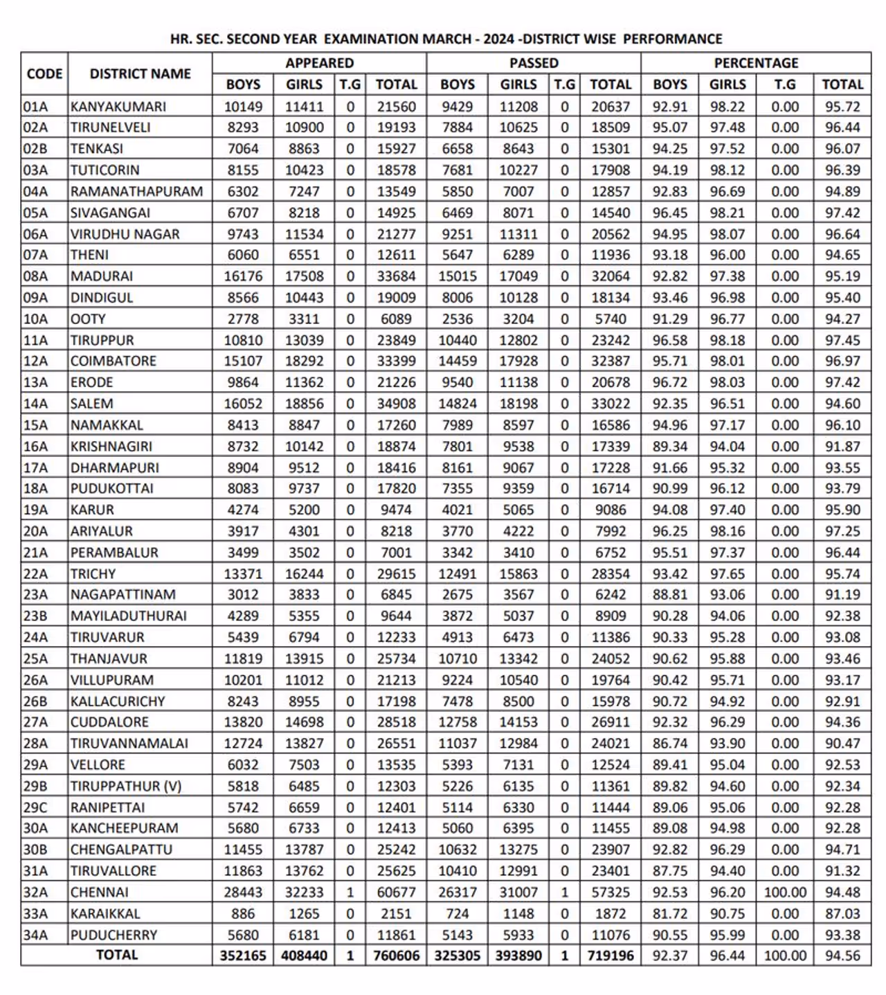 பிளஸ் 2 பொதுத் தேர்வில் ஒட்டுமொத்தமாக 94.56% மாணவ மாணவிகள் தேர்ச்சி பெற்றுள்ளனர். 2023ஆம் ஆண்டில் 94.03 சதவீதம் பேர் தேர்ச்சி பெற்றிருந்த நிலையில், இந்த ஆண்டு தேர்ச்சி சதவீதம் 0.53% அதிகரித்துள்ளது.