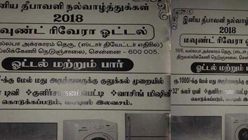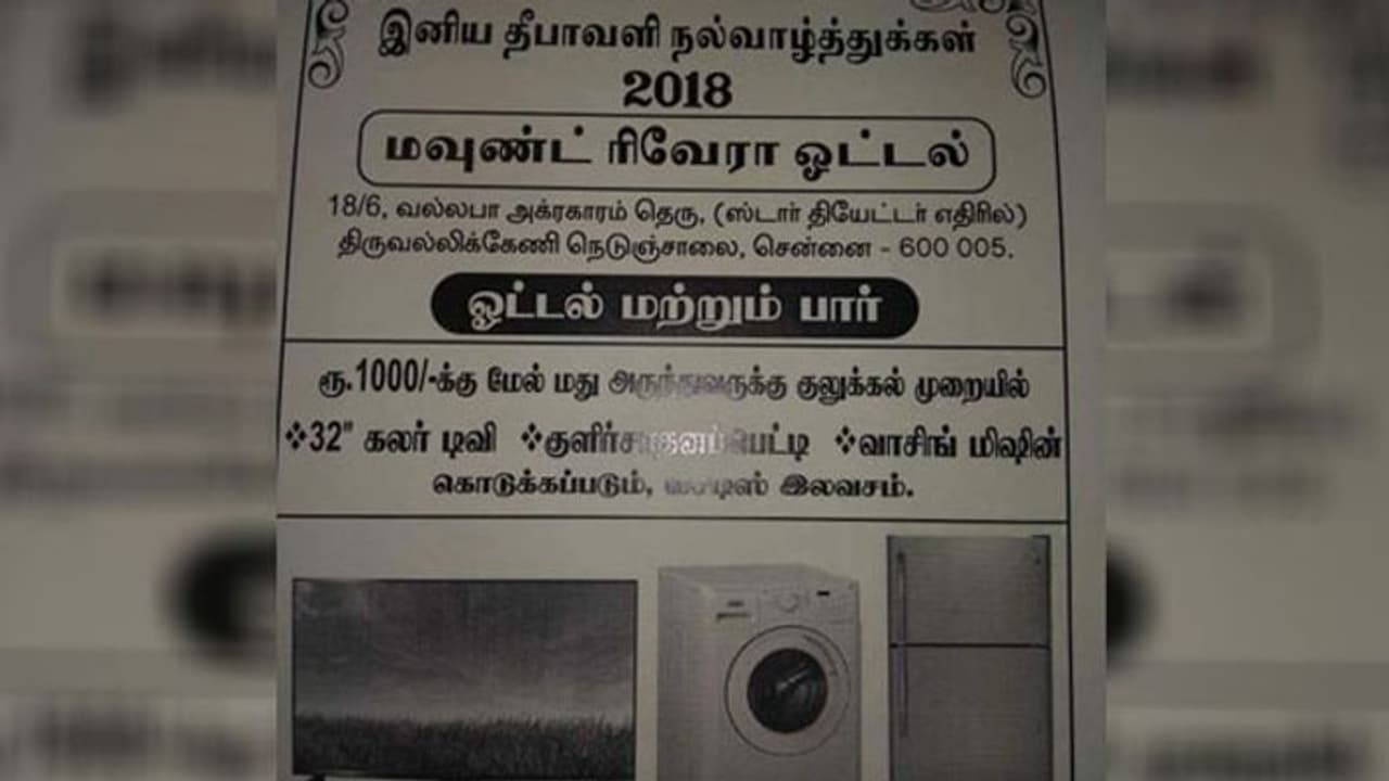 சென்னை திருவல்லிக்கேணி வல்லப தெரு மற்றும் அக்ரஹாரம் தெருவில் 3 விளம்பர பேனர்கள் இருந்தது. அதில், The Mount Rivera The Business Class Hotel With Barல், ரூ.1000க்கு மேல் மது அருந்துபவர்களுக்கு குலுக்கல் முறையில் எல்இடி டிவி, வாஷிங் மெஷின், ஏசி ஆகியவை வழங்கப்படும் என அறிவிக்கப்பட்டு இருந்தது.