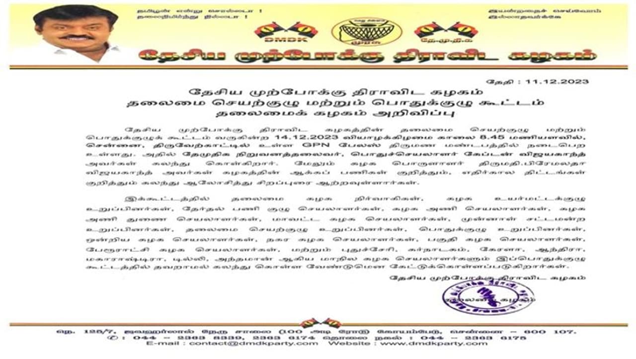 இதுகுறித்து தேமுதிக தலைமை கழகம் வெளியிட்டுள்ள அறிவிப்பில் கூறியிருப்பதாவது: “தேசிய முற்போக்கு திராவிட கழகத்தின் தலைமை செயற்குழு மற்றும் பொதுக்குழுக் கூட்டம் வருகின்ற 14.12.2023 வியாழக்கிழமை காலை 8.45 மணியளவில், சென்னை, திருவேற்காட்டில் உள்ள GPN பேலஸ் திருமண மண்டபத்தில் நடைபெற உள்ளது. அதில் தேமுதிக நிறுவனத்தலைவர், பொதுச்செயலாளர் கேப்டன் விஜயகாந்த் கலந்து கொள்கிறார்.