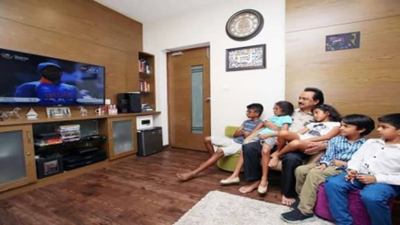 dmk action leader m.k.stalin watch india v pakishtan final with his grandchildren on fathers day