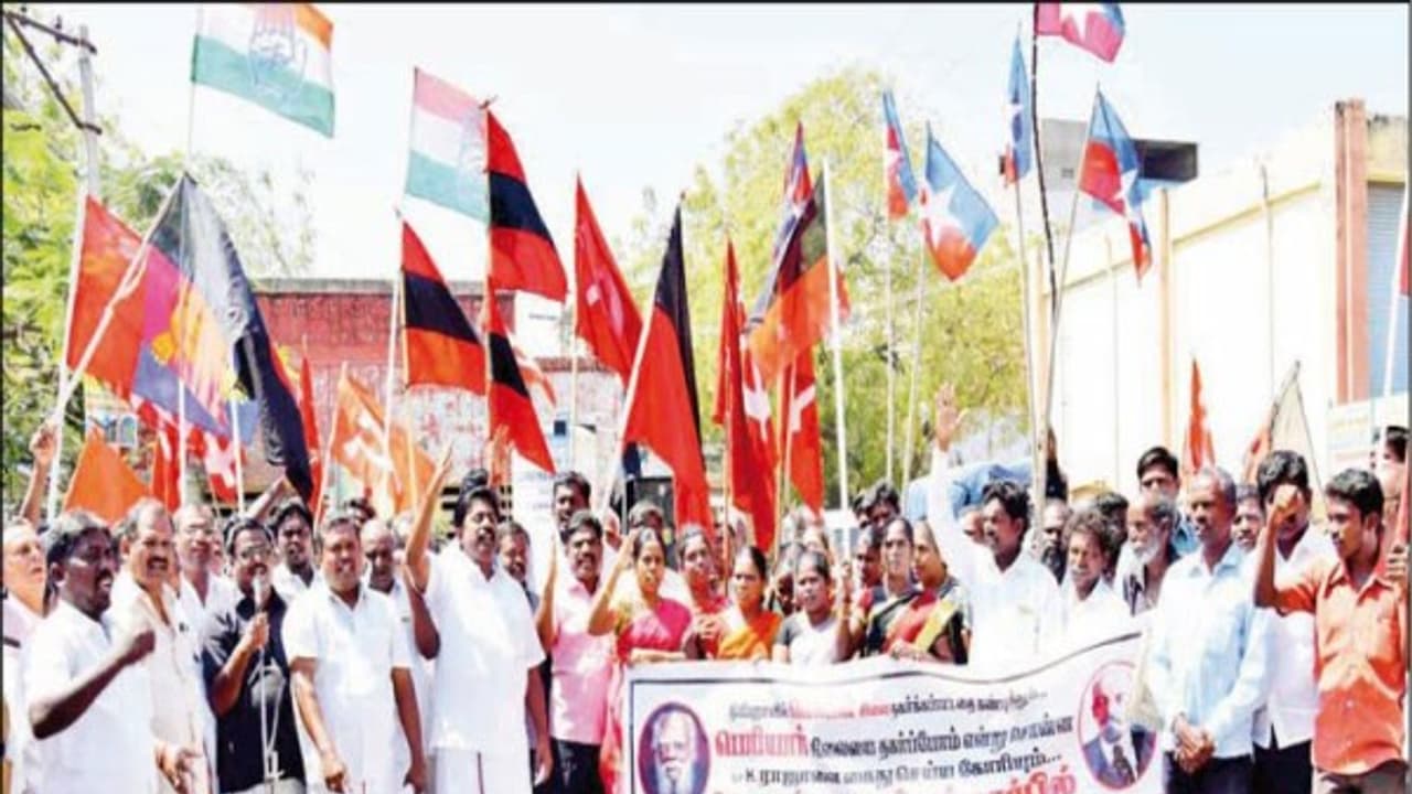 ராஜபாளையம் ஜவஹர் மைதானம் அருகே திராவிடர் கழகம் தலைமையில் நடைபெற்ற இந்த ஆர்ப்பாட்டத்தில் தி.மு.க. எம்.எல்.ஏ.யான தங்கப்பாண்டியன் பங்கேற்றார்.