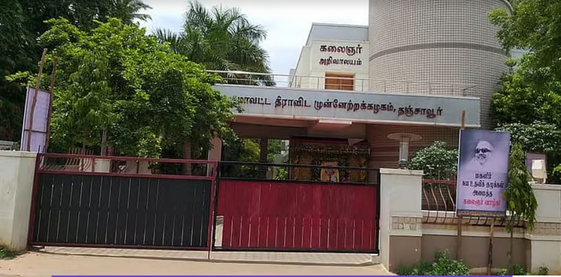 தஞ்சாவூர் மாவட்டத்தின் திமுக தலைவி அலுவலகமாக தஞ்சாவூர், முத்துக்குமார மூப்பனார் சாலையில் திமுக மாவட்ட அலுவலகமான கலைஞர் அறிவாலயம் உள்ளது. 15 வருடங்களுக்கு முன்பு தஞ்சை ஆத்து பாலத்திற்கு அருகில் இந்த அறிவாலயம் கட்டப்பட்டது. கலைஞர் கருணாநிதியே இதை திறந்து வைத்தார். தஞ்சாவூர் மட்டுமன்றி அப்போது ஒட்டுமொத்த டெல்டா மாவட்டங்களுக்குமே இந்த அறிவாலயம்தான் தலைமை கழகமாக இருந்தது.