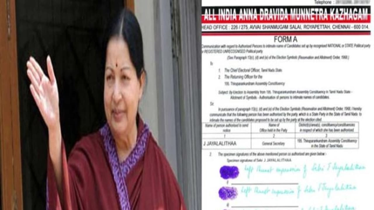 அப்போது அதிமுக வேட்பாளராக ஏ.கே.போஸையும், அவருக்கு இரட்டை இலை சின்னத்தை ஒதுக்கக் கோரியும், கட்சியின் பொதுச் செயலாளர் என்ற வகையில், ஜெயலலிதா தனது இடதுகை பெருவிரல் ரேகையை தேர்தல் ஆவணப் படிவத்தில் பதிவு செய்து கொடுத்ததாகக் கூறப்பட்டது. அவரிடம் கைரேகை பெறப்பட்டபோது, சென்னை அரசு பொது மருத்துவமனை டாக்டர் பாலாஜி, படிவத்தில் சான்று ஒப்பம் அளித்து தேர்தல் ஆணையத்திடம் சமர்ப்பித்திருந்தார்.