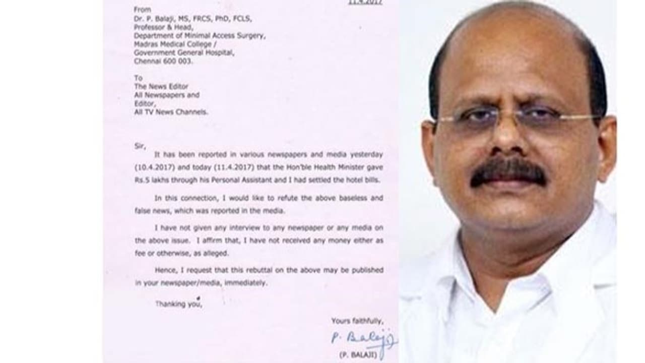 இந்நிலையில், கடந்த வெள்ளிக் கிழமை அமைச்சர் விஜய பாஸ்கர் வீட்டில் வருமான வரித்துறையினர் நடத்திய சோதனையில் கைப்பற்றப்பட்ட ஆவணங்களில் டாக்டர் பாலாஜிக்கு 5 லட்சம் ரூபாய் கொடுத்தாக குறிப்பிடப்பட்டிருந்தது,