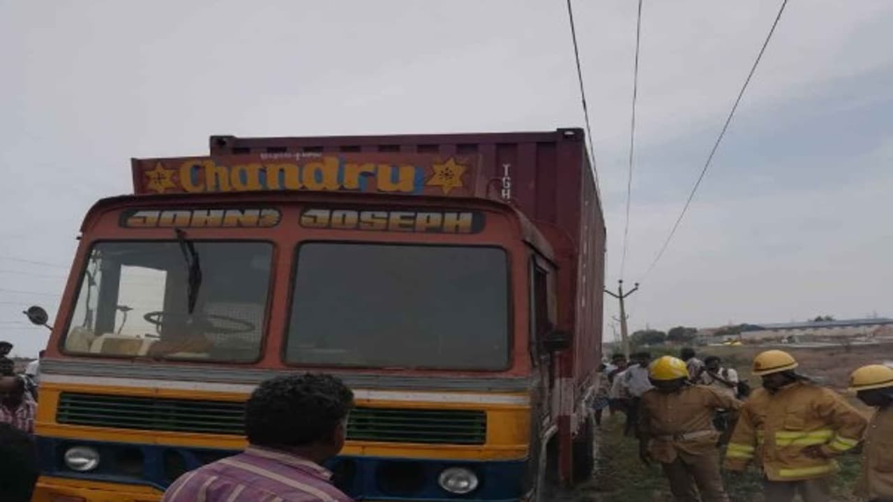 சாலையோரம் லாரி நிறுத்தப்பட்டபோது, மேலே சென்ற உயர் அழுத்த மின்சார கம்பியில் உரசியபடியே நின்றது. அப்போது, திடீரென லாரியின் டயர் தீப்பற்றி எரிந்தது.