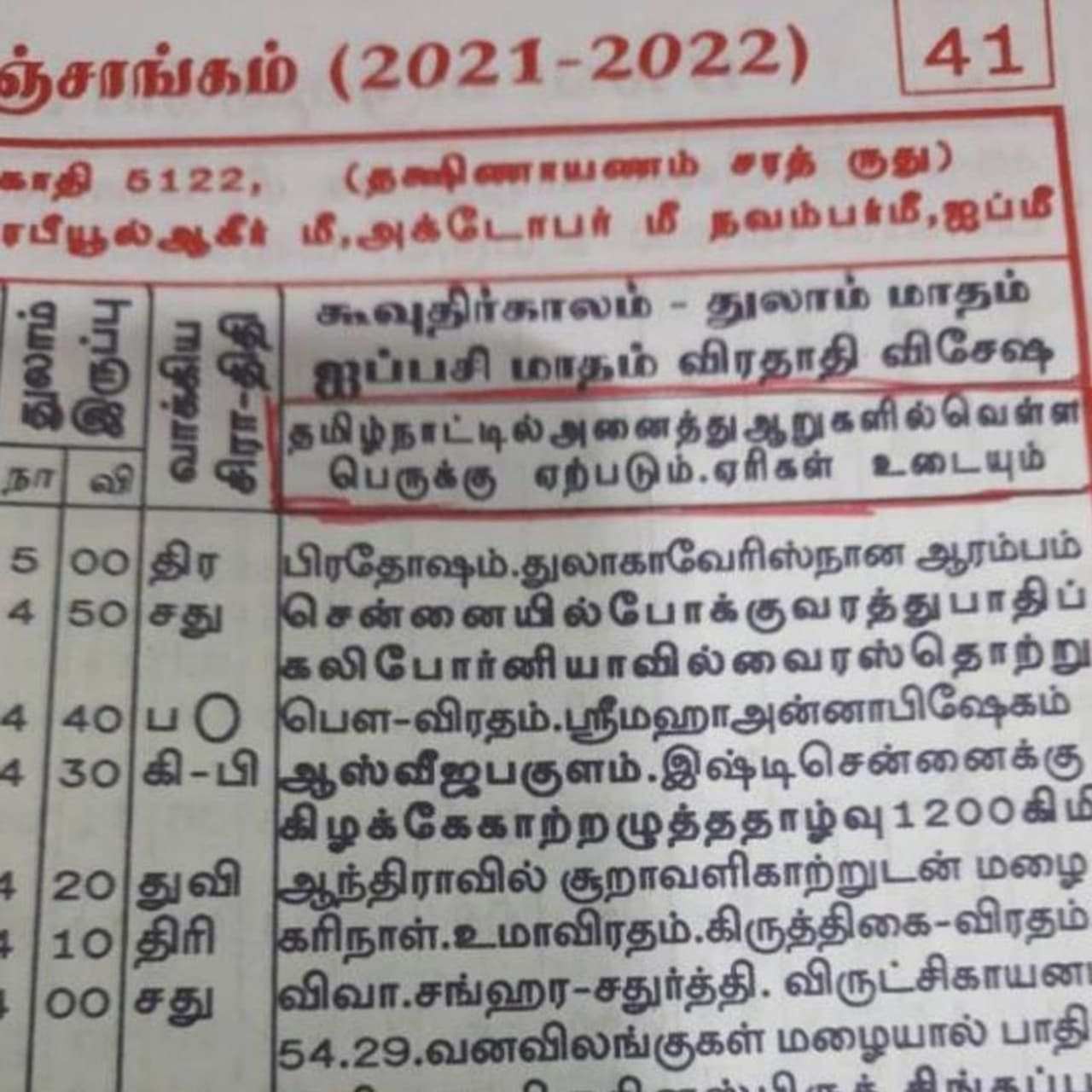 நேற்று தமிழ்ப் புத்தாண்டு விழாவையொட்டி ராமேஸ்வரம் ராமநாதசுவாமி கோயிலில் குருக்கள் உதயகுமார் ஆற்காடு சீதாராமய்யர் எழுதிய பஞ்சாங்கத்தை வாசித்தார்.இதில், 'வரும் அக்டோபர் முதல் டிசம்பர் வரை 19 புயல் சின்னங்கள் உருவாகி 12 பலவீனமாகி 7 அதிதீவிர புயலாக வீசும். இதனால் சென்னை, செங்கல்பட்டு, கடலூர், விழுப்புரம், நாகையில் பல கடலோர பகுதியில் கனமழை பெய்து வெள்ளப்பெருக்கு ஏற்படும்.