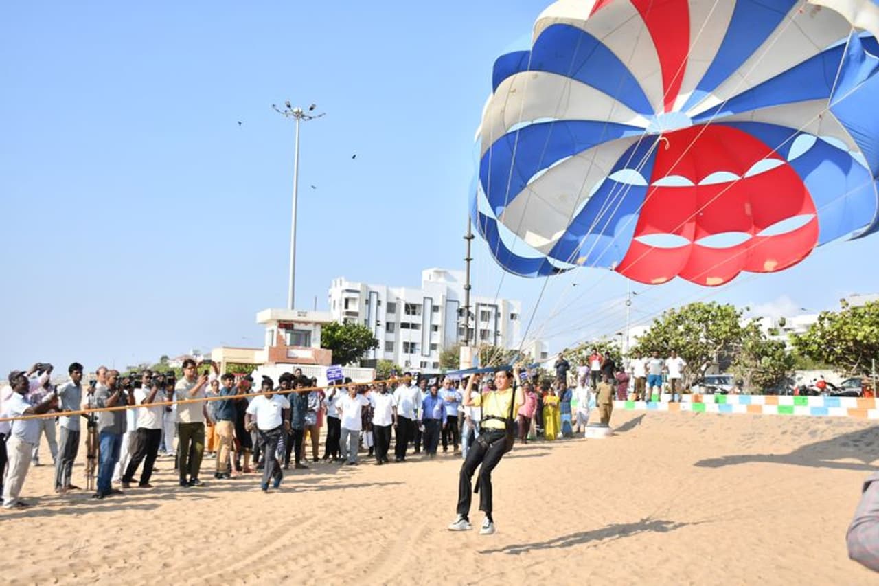 நாடாளுமன்ற தேர்தலில் 100% வாக்குப்பதிவிற்கான பொதுமக்களுக்கு விழிப்புணர்வு ஏற்படுத்தும் வகையில், சென்னை தேர்தல் அதிகாரி ராதாகிருஷ்ணன் பாரா செய்லிங் செய்து விழிப்புணர்வு ஏற்படுத்தினார்.