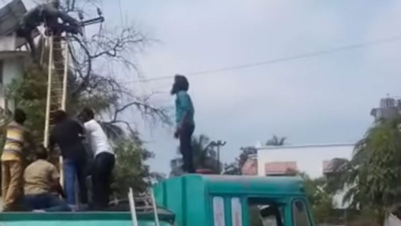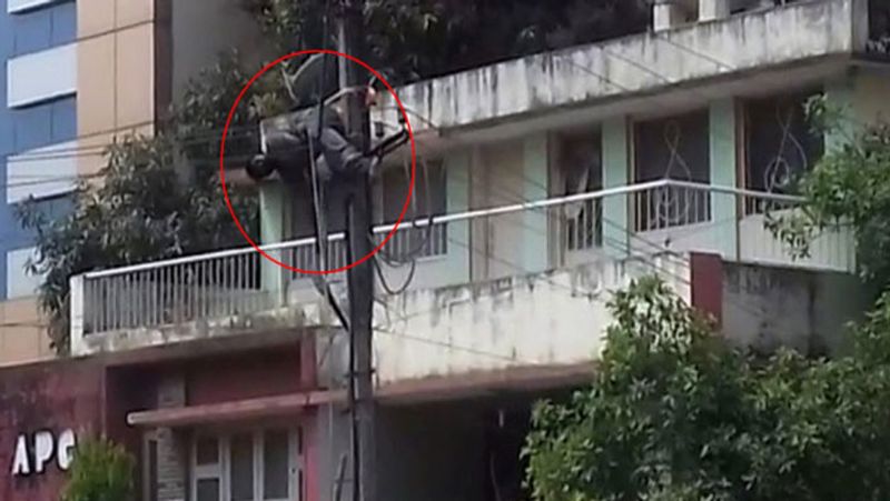 அப்போது, திடீரென மின்சாரம் பாய்ந்ததால் பிடியை விட்ட சீனிவாசன் மயங்கிய நிலையில் அந்தரத்தில் தொங்கினார். இதனை அறிந்த சக ஊழியர்கள் அதிச்சியடைந்தனர். பின்னர், உடனடியாக மின்சாரத்தை தடை செய்தனர். அந்த வழியாக வந்த டேங்கர் லாரியை மடக்கி நிறுத்தி அதன் மீது ஏறி மயங்கிய நிலையில் தொங்கிக் கொண்டிருந்த சீனிவாசன் இடுப்பில் இருந்த கயிற்றை அறுத்து கீழே கொண்டு வந்து அருகில் உள்ள தனியார் மருத்துவமனையில் சேர்த்தனர்.