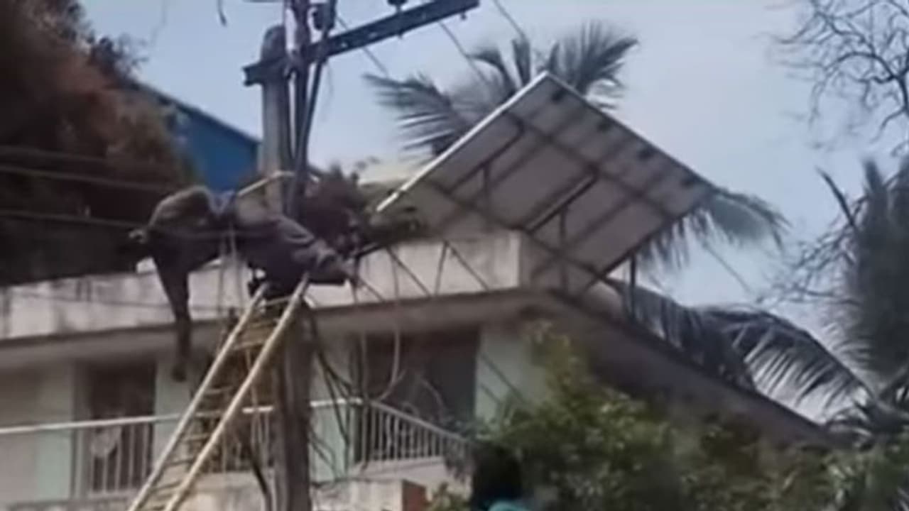 சென்னை பள்ளிக்கரணை அருகே மின்கம்பத்தின் மீது ஏறி பழுது சீரமைப்பு பணியில் ஈடுபட்டபோது, மின்சாரம் பாய்ந்ததால் ஊழியர் அந்தரத்தில் தொங்கிய சம்பவம் பரபரப்பை ஏற்படுத்தியது.