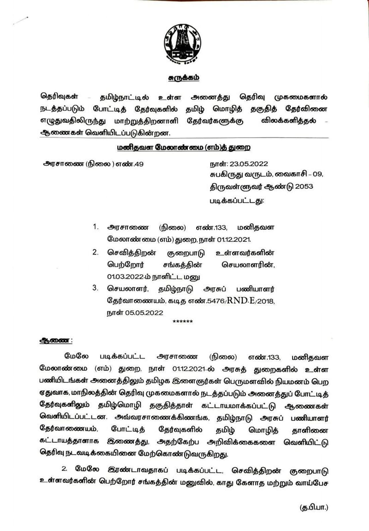 இதுகுறித்து தமிழக அரசு வெளியிட்டுள்ள அரசாணையில், தமிழ்நாட்டில் உள்ள அனைத்து தெரிவு முகமைகளால் நடத்தப்படும் போட்டித் தேர்வுகளில் தமிழ் மொழித் தகுதித் தேர்வினை எழுதுவதில் இருந்து மாற்றுத்திறனாளிகளுக்கு விலக்கு அளிப்பது தொடர்பாக அரசாணை வெளியிடப்பட்டுள்ளது.