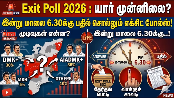 2026 தமிழ்நாடு சட்டமன்றத் தேர்தலின் வாக்குப்பதிவு நிறைவடைந்த நிலையில், ஒட்டுமொத்த தமிழகமும் ஆவலுடன் எதிர்பார்த்துக்கொண்டிருக்கும் எக்சிட் போல் (Exit Poll) முடிவுகள் இன்று வெளியாகின்றன! திமுக, அதிமுக, மற்றும் முதல்முறையாக களம் கண்டுள்ள விஜய்யின் தவெக ஆகிய கட்சிகளில் யாருக்கு மக்களின் ஆதரவு அதிகம்? இன்று மாலை 6:30 மணி அளவில் பல்வேறு முன்னணி நிறுவனங்களின் தேர்தலுக்குப் பிந்தைய கருத்துக் கணிப்பு முடிவுகளைத் தொகுத்து வழங்குகிறோம்.