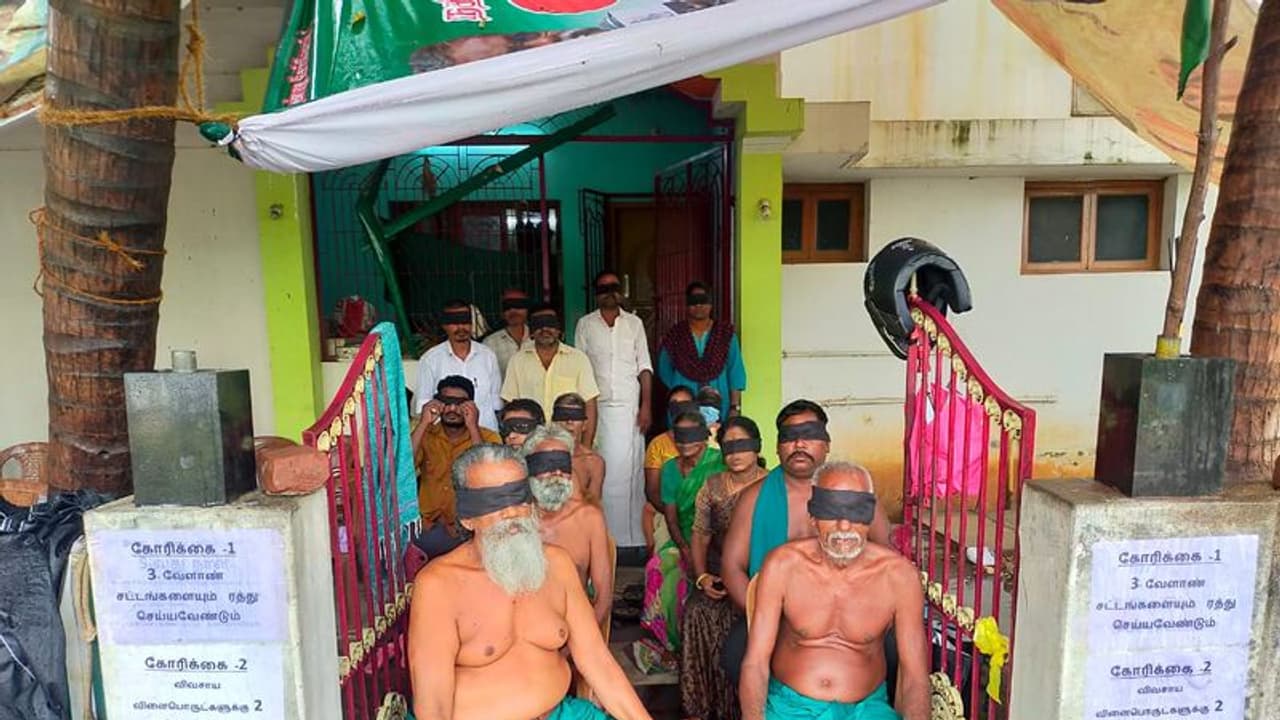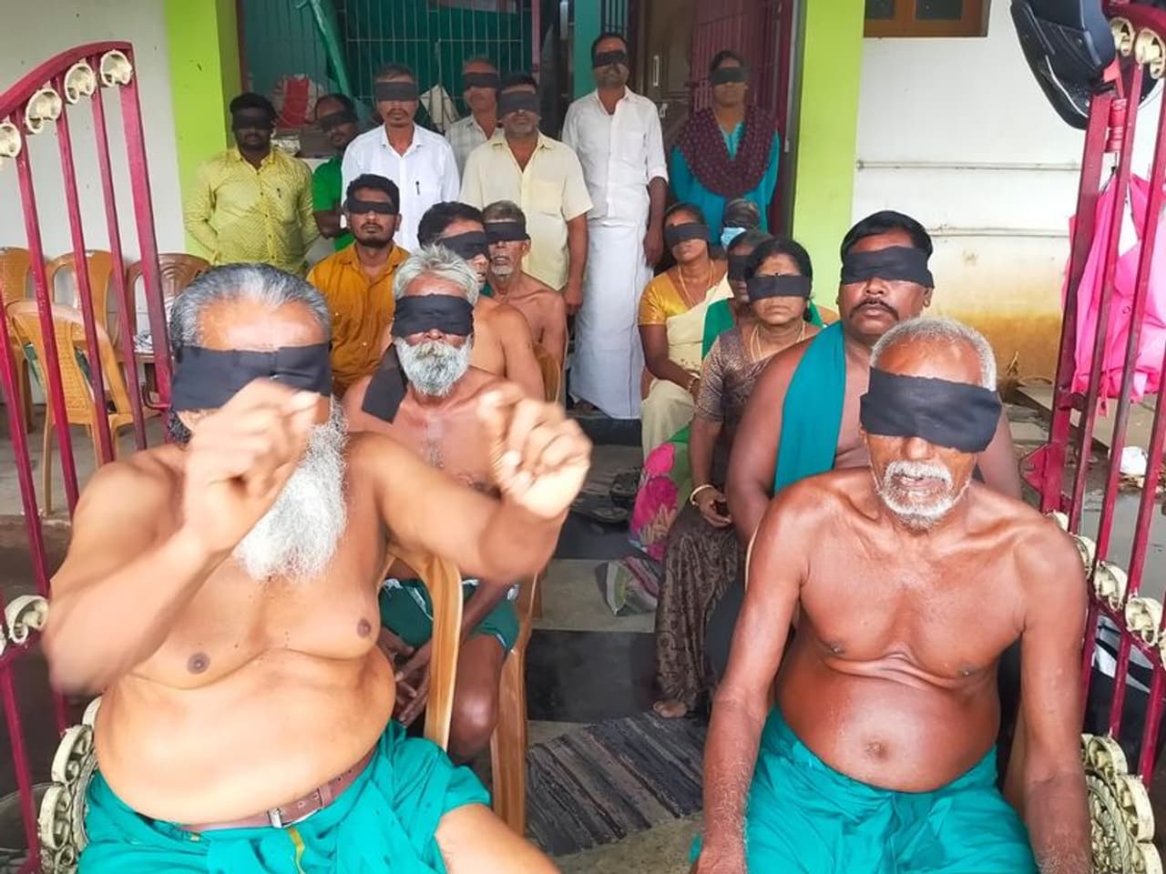 தொடர்ந்து ஒன்பதாவது நாள் பிரதமர் மோடி காலில் விழுந்து காப்பாற்று காப்பாற்று என கெஞ்சியும், பத்தாவது நாள் இலை தளைகள் கட்டி கொண்டு ஆதிவாசி போன்றும், பதினொன்றாவது நாள் சங்கிலியால் கால்களை கட்டிக்கொண்டும், பன்னிரெண்டாவது நாள் வாயில் ரப்பாரை வைத்து கொண்டும், பதிமூன்றாவது நாள் முகங்களில் கரியை பூசிக்கொண்டும், பதினான்காவது நாள் நெஞ்சில் கல்லை போட்டுக்கொண்டும், பதினைந்தாம் நாள் சங்கு ஊதி மணி அடித்தும், பதினாறாவது நாள் எலும்புகளுக்கு பால் தெளித்து ஈமக்காரியம் செய்தும், பதினேழாவது நாள் இறந்த விவசாயிகளின் அஸ்தியை காவிரியில் கரைத்தும் போராட்டத்தில் ஈடுபட்டனர். அந்த வரிசையில் இன்று 18வது நாளாக இறந்த விவசாயிகளின் அஸ்தியை கரைக்க சென்ற விவசாயிகளை மத்திய அரசு காவல்துறையை வைத்து தடுத்து விவசாயிகளை கண்ணிருந்தும் குருடர்களாக மாற்றியதாக கூறி விவசாயிகள் கண்களை கட்டி உண்ணாவிரதப் போராட்டத்தில் ஈடுபட்டனர்.