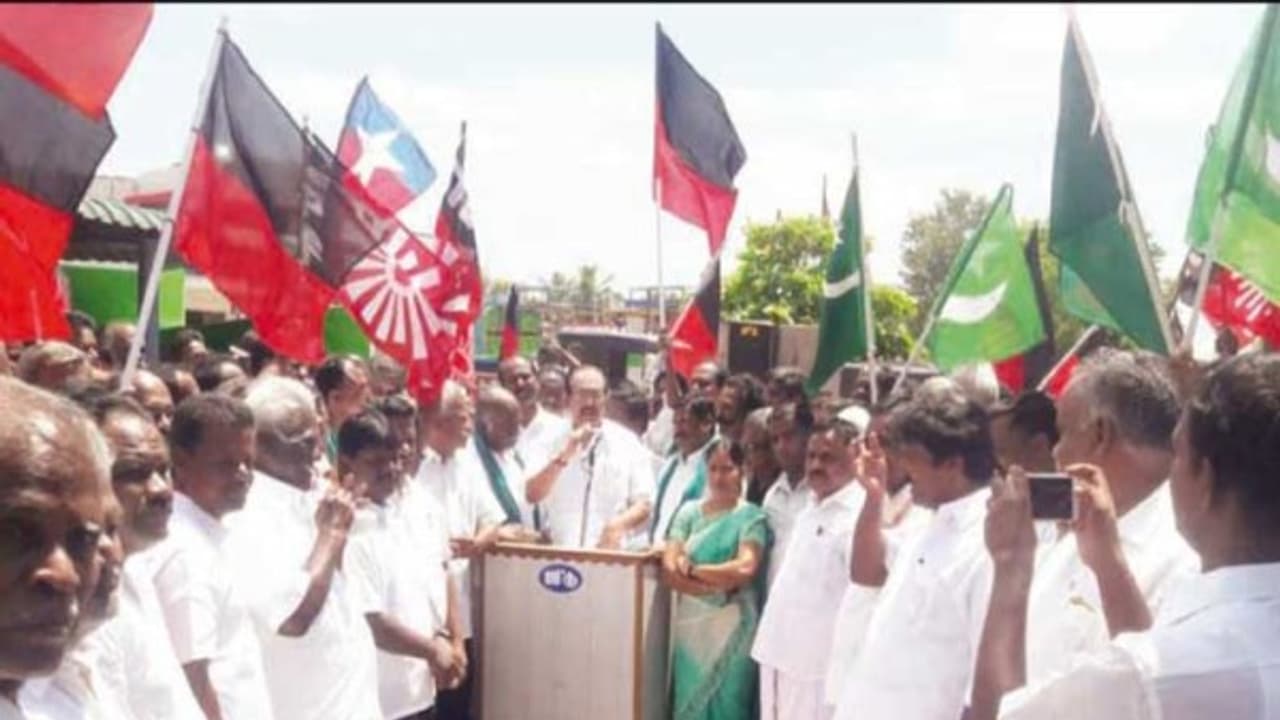 பெரம்பலூர் மாவட்டத்தில் அனைத்து விவசாய சங்கங்களின் ஒருங்கிணைப்புக் குழு மற்றும் திமுக, காங்கிரஸ், கம்யூனிஸ்டு கட்சிகள், விடுதலைச் சிறுத்தைகள் கட்சி உள்ளிட்ட தோழமைக் கட்சியினர் ஆர்ப்பாட்டம் நடத்தினர்.
