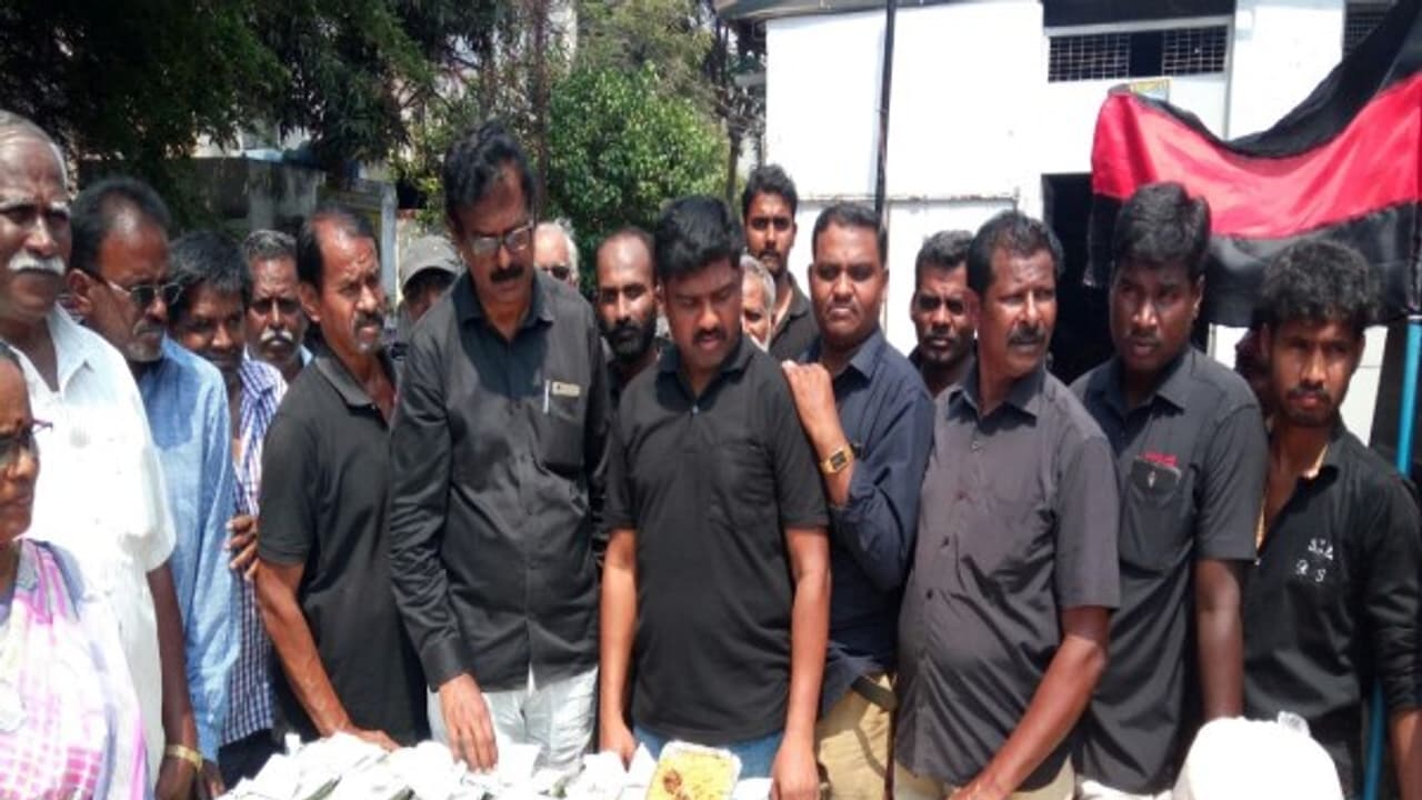 வைரமுத்துவை எதிர்த்து உண்ணாவிரதம் இருக்கும் ஜீயரை கண்டித்து கோயம்புத்தூரில் தந்தை பெரியார் கழகத்தினர் உண்ணும் போராட்டத்தில் ஈடுபட்டு வருகின்றனர்.