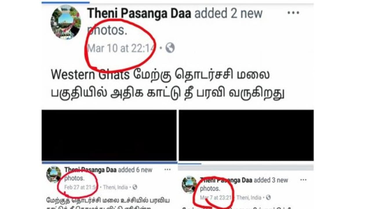 மேற்கு தொடர்ச்சி மலை உச்சியில் பரவிய காட்டுத்தீ கொழுந்துவிட்டு எரியும் காட்சிகளை வளைதள வாசி ஒருவர் கடந்த 27 ஆம் தேதியே முகநூலில் புகைப்படங்களுடன் பதிவிட்டிருப்பது பெரும் அதிர்ச்சியை ஏற்படுத்தியுள்ளது.