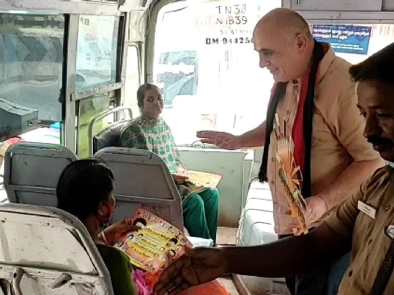 ருமேனிய நாட்டைச் சேர்ந்த இவர் தொழில் நிமித்தமாக பிசினஸ் விசாவில் கோவைக்கு வந்துள்ளார்.திமுகவை சேர்ந்த மருத்துவர் கோகுல் என்பவரின் நண்பரான ஸ்டெஃபன், தனது நண்பரின் மூலம் தமிழ்நாடு அரசின் பெண்களுக்கான இலவச பேருந்து பயணத் திட்டம் உள்ளிட்ட நலத்திட்டங்களை பற்றி அறிந்து பரப்புரையில் ஈடுபட்டதாக கூறப்படுகிறது.தோளில் திமுக துண்டு அணிந்தவாறு, சாலையில் நடந்து சென்றும், இரண்டு சக்கர வாகனம் மற்றும் பேருந்துகளில் பயணித்தும் பொது மக்களுக்கு துண்டு பிரசுரங்கள் கொடுத்து திமுகவுக்கு ஆதரவு திரட்டினார்.