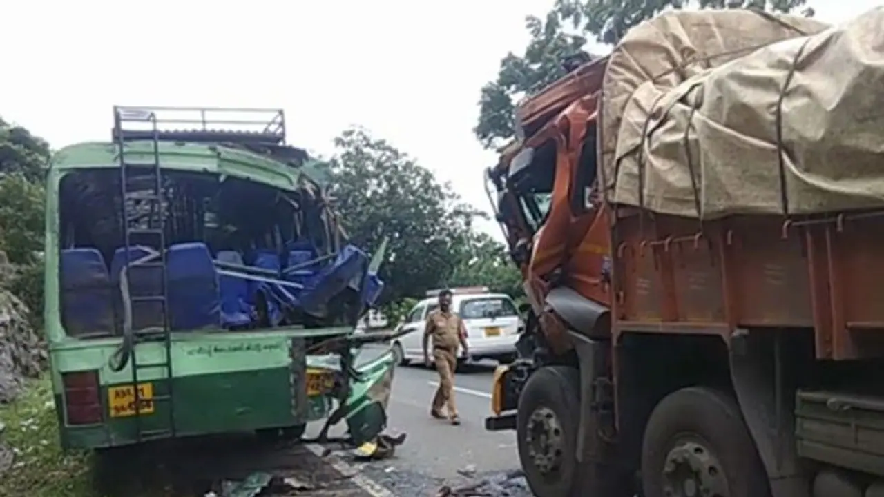 செங்கல்பட்டு அருகே அரசு பேருந்து மீது லாரி மோதி விபத்துக்குள்ளானது. இந்த விபத்தில் 10 பயணிகள் காயமடைந்துள்ளனர்.