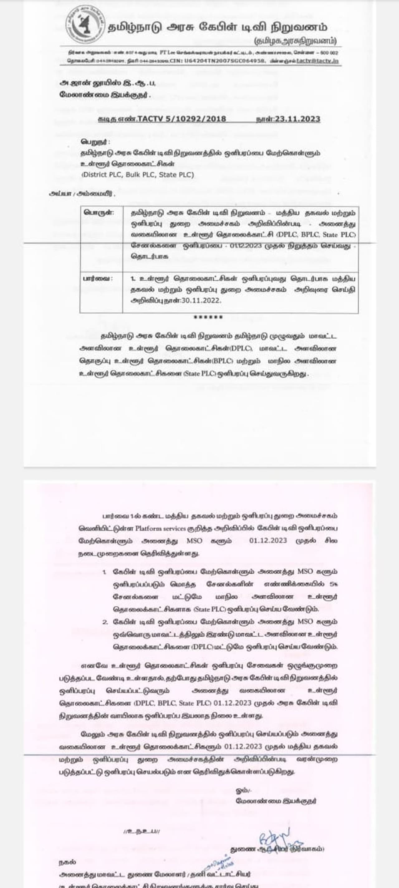 கேபிள் டிவி ஒளிப்பரப்பை மேற்கொள்ளும் அனைத்து MSOகளும் ஒவ்வொரு மாவட்டத்திலும் இரண்டு மாவட்ட அளவில் உள்ளூர் தொலைக்காட்சிகள் மட்டுமே ஒளிப்பரப்பு செய்ய வேண்டும். எனவே உள்ளூர் தொலைக்காட்சிகள் ஒளிப்பரப்பு சேவைகள் ஒழுங்குமுறைப்படுத்தப்பட வேண்டியுள்ளதால் தற்போது தமிழ்நாடு அரசு கேபிள் டிவி நிறுவனத்தில் ஒளிப்பரப்பு செய்யப்பட்டு வரும் அனைத்து வகையான உள்ளூர் தொலைக்காட்சிகளை டிசம்பர் 1ம் தேதி முதல் அரசு கேபிள் டிவி நிறுவனத்தின் வாயிலாக ஒளிபரப்ப இயலாத நிலை உள்ளதாக தெரிவிக்கப்பட்டுள்ளது.