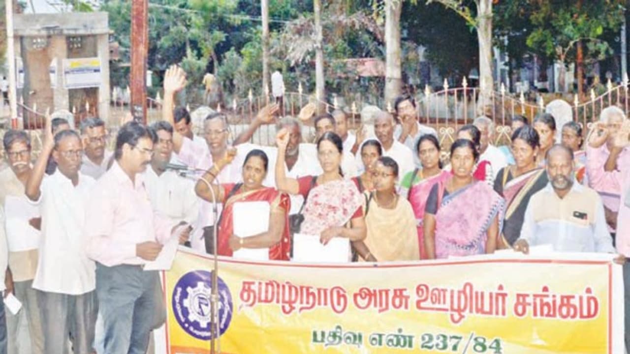 தஞ்சாவூர் மாவட்டம், பனகல் கட்டிடம் முன்பு தஞ்சாவூர் மாவட்ட அரசு ஊழியர் சங்கத்தினர் நேற்று ஆர்ப்பாட்டத்தில் ஈடுபட்டனர்.