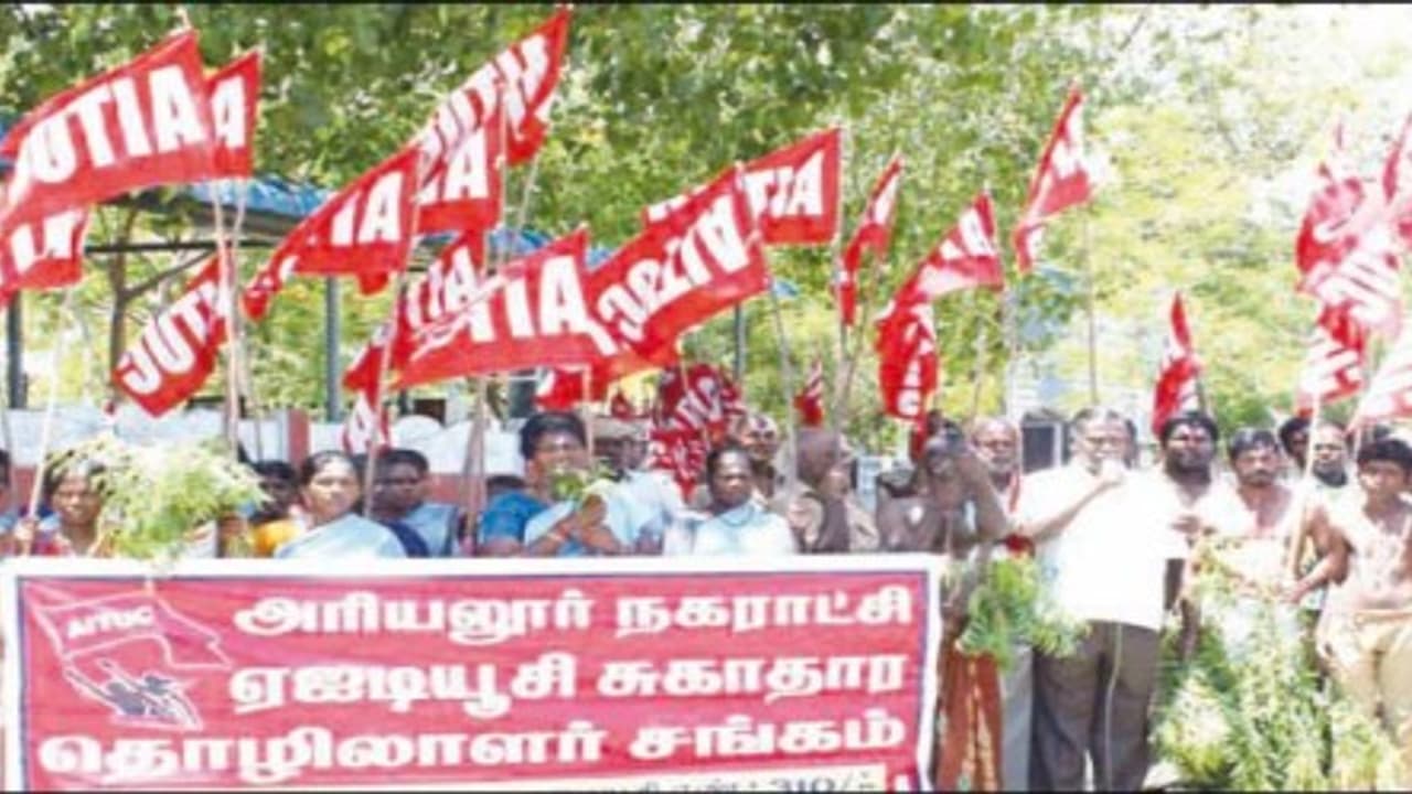 அரியலூர் அண்ணா சிலை அருகே ஏ.ஐ.டி.யூ.சி. சுகாதார தொழிலாளர்கள் பல்வேறு கோரிக்கைகளை வலியுறுத்தி நெற்றி மற்றும் உடம்பில் பட்டை நாமமிட்டும், வேப்பிலையை கையில் ஏந்தியும் நூதன முறையில் ஆர்ப்பாட்டத்தில் ஈடுபட்டனர்.