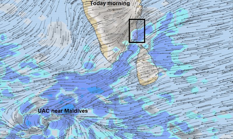 “தமிழகத்தின் உட்பகுதிகளில் ஈரப்பதமான சூழலை உண்டாக்கும் நிகழ்வால் மழை பெய்யும். தற்போது நாகை, திருவாரூர், தஞ்சாவூர், கடலூர், அரியலூர் ஆகிய மாவட்டங்களில் மழை பெய்து கொண்டிருக்கிறது. இன்று மாலை மேற்கு உட்பகுதிகளான விருதுநகர், திருநெல்வேலி, திருப்போரூர், திண்டுக்கல், கோயம்புத்தூர், ஈரோடு, சேலம், நாமக்கல், பெரம்பலூர், அரியலூர், திருச்சி, தேனி, நீலகிரி, மதுரை, சிவகங்கை ஆகிய பகுதிகளில் மழை பெய்யும்.