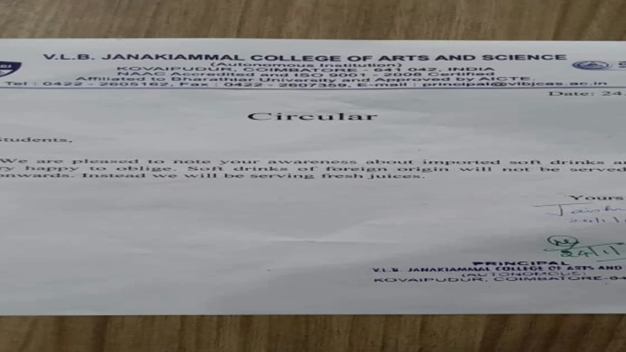 கோவை ஜானகியம்மாள் கலைக் கல்லூரியில் பன்னாட்டுக் குளிர்பானத்துக்குத் தடை விதித்தும், அதற்குப் பதிலாக பழச்சாறுகள் வழங்கப்படும் என்று கல்லூரி முதல்வர் சுற்றறிக்கை வெளியிட்டு அசத்தியுள்ளார்.