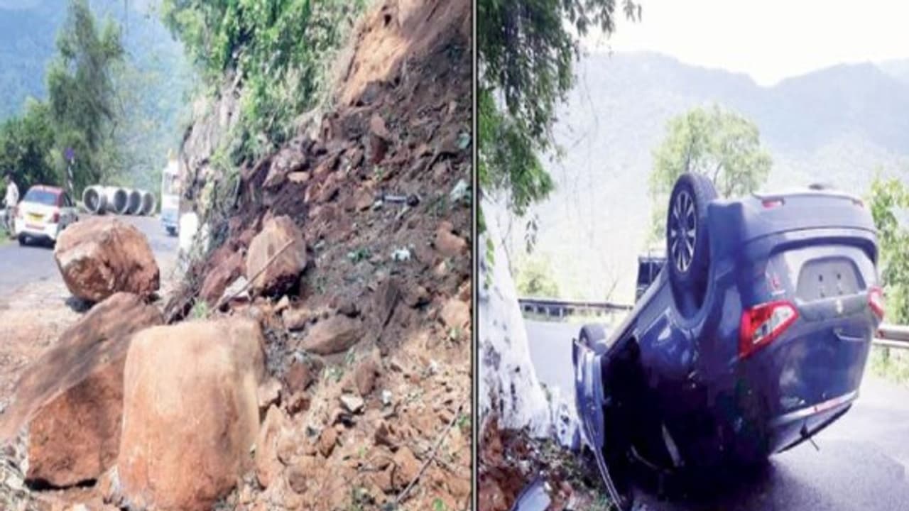 அப்போது மழை காரணமாக மலைப்பாதையில் கிடந்த பாறை மீது கார் மோதி தலைகுப்புற கவிழ்ந்தது. இதில் காரின் இடிபாடுகளில் சிக்கி ஐந்து பேர் காயமடைந்தனர்.