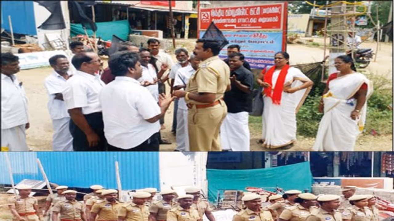 அப்போது காவலாளர்கள், "கருப்பு கொடி ஏற்றி போராட்டம் செய்வது சட்டப்படி குற்றம், மீறுபவர்கள் மீது கைது நடவடிக்கை எடுக்கப்படும்" என்று எச்சரிக்கை விடுத்தனர்.