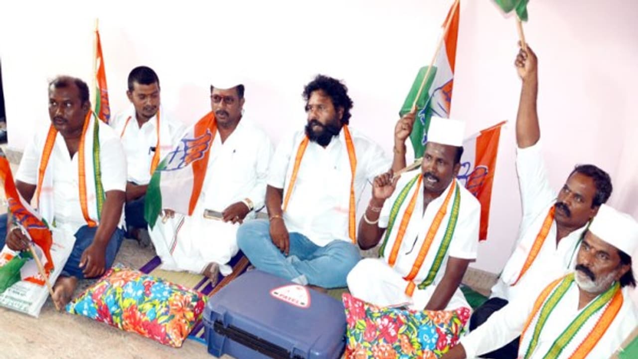 குடியேறும் போராட்டம் நடத்த வந்த காங்கிரசு நிர்வாகிகள், கட்சியின் அலுவலக அறை முன்பாக பாயை விரித்து காங்கிரசு கொடியை கையில் பிடித்துகொண்டு உட்கார்ந்தனர்.