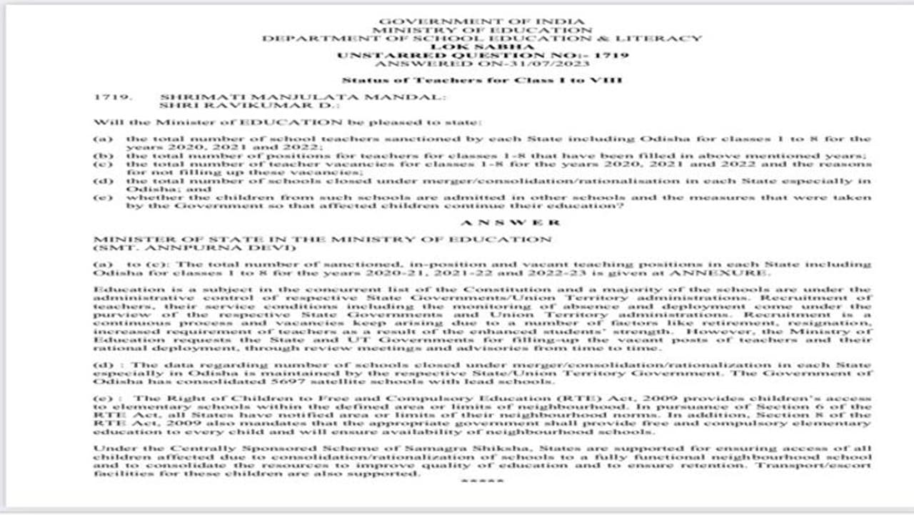 நாடாளுமன்ற மழைக்காலக் கூட்டத்தொடரில், “2020, 2021 மற்றும் 2022 ஆம் ஆண்டுகளில் 1 முதல் 8 ஆம் வகுப்புகளுக்கு ஒவ்வொரு மாநிலத்திலும் அனுமதிக்கப்பட்ட பள்ளி ஆசிரியர்களின் மொத்த எண்ணிக்கையைக் கூறுக? மேலே குறிப்பிட்ட ஆண்டுகளில் நிரப்பப்பட்ட 1-8 வகுப்புகளுக்கான ஆசிரியர்களுக்கான மொத்த பணியிடங்களின் எண்ணிக்கையைத் தெரிவிக்கவும்; 2020, 2021 மற்றும் 2022 ஆம் ஆண்டுகளுக்கான 1-8 வகுப்புகளுக்கான மொத்த ஆசிரியர் காலியிடங்களின் எண்ணிக்கை மற்றும் இந்த காலியிடங்களை நிரப்பாததற்கான காரணங்களை வழங்குக? குறிப்பாக ஒவ்வொரு மாநிலத்திலும் இணைப்பு /ஒருங்கிணைத்தல்/பகுத்தறிவு ஆகியவற்றின் கீழ் மூடப்பட்ட பள்ளிகளின் மொத்த எண்ணிக்கை மற்றும் அத்தகைய பள்ளிகளைச் சேர்ந்த குழந்தைகள் வேறு பள்ளிகளில் சேர்க்கப்படுகிறார்களா? பாதிக்கப்பட்ட குழந்தைகள் கல்வியைத் தொடர அரசால் எடுக்கப்பட்ட நடவடிக்கைகள் எவை என்பதைக் கூறுக?” ஆகிய கேள்விகளை விழுப்புரம் எம்.பி., ரவிக்குமார் எழுப்பியிருந்தார்.