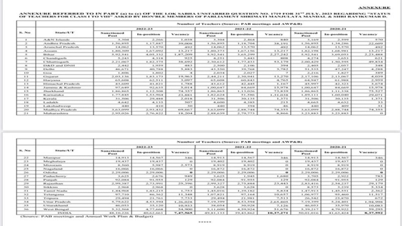 அதற்கு ஒன்றிய கல்வித்துறை இணை அமைச்சர் அன்னபூர்ணாதேவி எழுத்துப்பூர்வமாக பதிலளித்துள்ளார். அதன்படி, 2023 ஆம் ஆண்டில் தமிழ்நாட்டில் ஒப்பளிக்கப்பட்ட மொத்த ஆசிரியர் பணி இடங்கள் 1,44,968 எனவும் அதில் 143215 நிரப்பப்பட்டவை எனவும்; 1753 இடங்கள் இன்னும் நிரப்பப்பட வேண்டியவை எனவும் தெரிவிக்கப்பட்டுள்ளது.