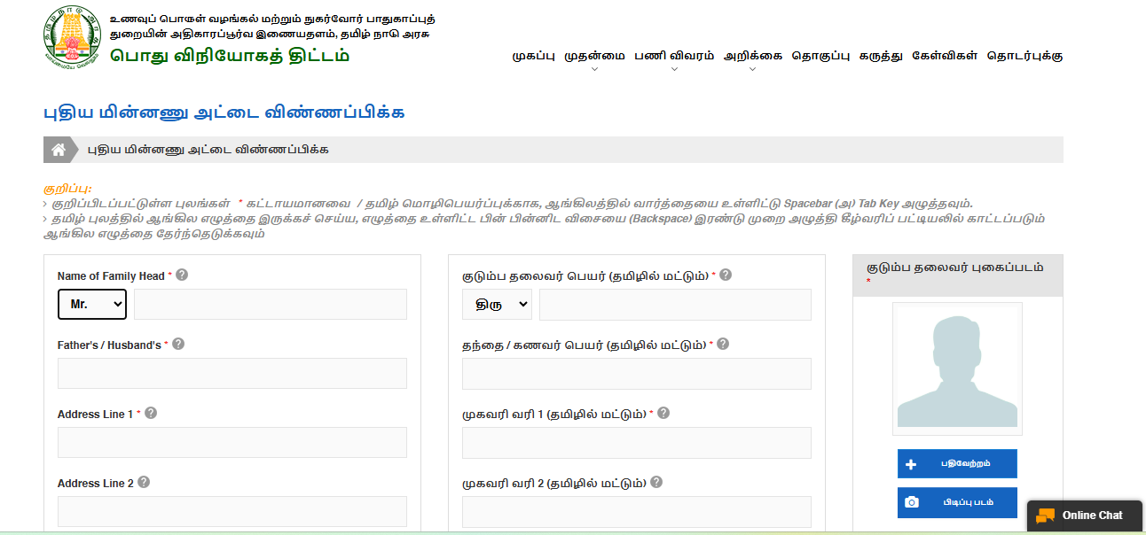 ·ஆவணங்களைப்பதிவேற்றவும்:தேவையானஆவணங்களானஆதார்அட்டை, முகவரிச்சான்று, குடும்பஉறுப்பினர்களின்புகைப்படங்கள்போன்றவற்றைபதிவேற்றவும். ஆவணங்கள்தெளிவாகவும், சரியானஅளவிலும்இருக்கவேண்டும்.