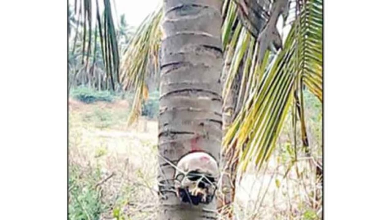 தென்னை மரங்களில் மனித மண்டை ஓடுகள் கட்டி தொங்கவிடப்பட்டு இருந்ததால் அந்தப் பகுதியில் பெரும் பரபரப்பு ஏற்பட்டது.