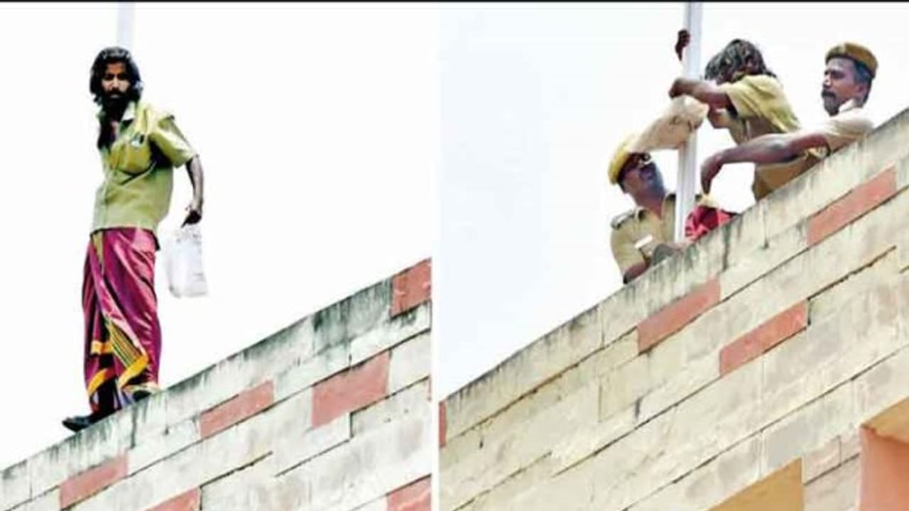 இதனைப் பார்த்து, அதிர்ச்சியடைந்த காவலாளர்கள் மாடிக்கு ஓடினர். பின்னர் நைசாக அவருடைய காலை பிடித்து தடுப்பு சுவரில் இறக்கி கீழே கொண்டுவந்து விசாரித்தனர். அப்போது, "தனது மனைவியை தன்னுடன் சேர்த்து வைக்க வேண்டும்" என்று கூறினார்.