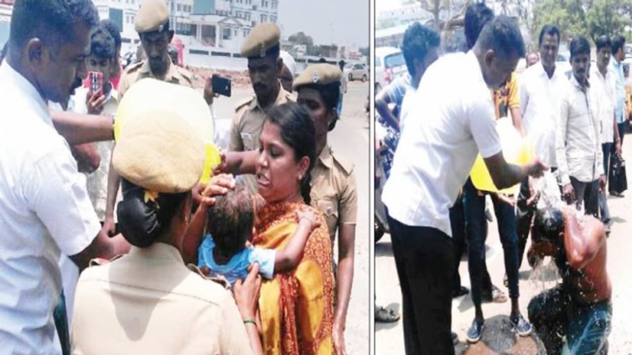 திடீரென்று மூவரும் தாங்கள் கொண்டுவந்த கேனில் இருந்து பெட்ரோலை உடலில் ஊற்றி தீக்குளிக்க முயன்றனர். அதற்குள் அங்கிருந்த காவலாளர்கள் அவர்களை தடுத்து நிறுத்தினார்கள். குடங்களில் தண்ணீர் கொண்டுவந்து அவர்கள் மீது ஊற்றினார்கள்.