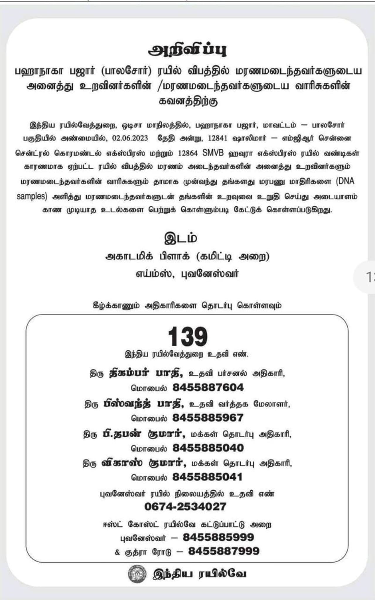 இது தொடர்பாக நாளிதழ்களில் விளம்பரம் அளித்துள்ள ரயில்வேத்துறை, பஹாநாகா பஜார் (பாலசோர்) ரயில் விபத்தில் மரணமடைந்தவர்களுடைய அனைத்து உறவினர்களின் /மரணமடைந்தவர்களுடைய வாரிசுகளின் கவனத்திற்கு. இந்திய ரயில்வேத்துறை, ஒடிசா மாநிலத்தில், பஹாநாகா பஜார், மாவட்டம் – பாலசோர் பகுதியில் அண்மையில், 02.06.2023 தேதி அன்று. 12841 ஷாலிமார் - எம்ஜிஆர் சென்னை சென்ட்ரல் கொரமண்டல் எக்ஸ்பிரஸ் மற்றும் 12864 SMVB ஹவுரா எக்ஸ்பிரஸ் ரயில் வண்டிகள்,
