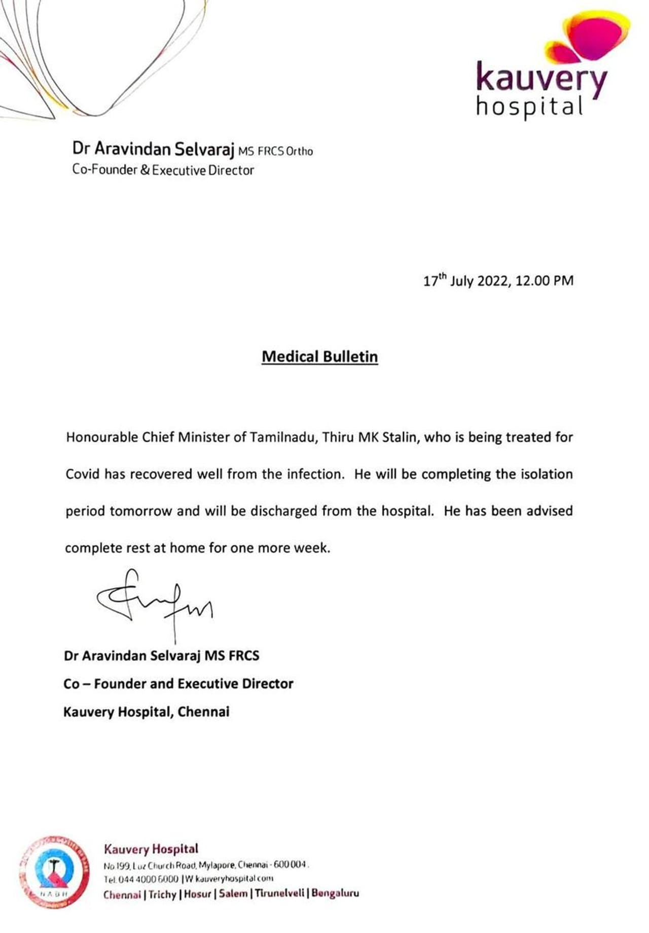 இதனையடுத்து மருத்துவர்களின் கண்காணிப்பில் முதலமைச்சர் இருப்பதாகவும், அவரது உடல்நிலையை தொடர்ந்து கண்காணித்து வருவதாக தெரிவிக்கப்பட்டது. இதனையடுத்து முதலமைச்சர் இன்று வீடு திரும்புவார் என கூறப்பட்டது. இந்தநிலையில் காவேரி மருத்துவமனை சார்பாக அறிக்கை ஒன்று வெளியிடப்பட்டுள்ளது. அதில், கொரோனா பாதிப்பில் இருந்து முதலமைச்சர் மு.க.ஸ்டாலின் உடல்நலம் தேறி வருவதாக தெரிவிக்கப்பட்டுள்ளது. முதலமைச்சர் உடல் நிலை கண்காணிக்கப்பட்டு வருவதாகவும் நாளை வீடு திரும்புவார் என கூறப்பட்டுள்ளது. மேலும் அடுத்த ஒரு வாரத்திற்கு முதலமைச்சர் வீட்டில் கண்டிப்பாக ஓய்வு எடுக்க வேண்டும் என மருத்துவர்கள் அறிவுறுத்தியுள்ளதாக அந்த அறிக்கையில் தெரிவிக்கப்பட்டுள்ளது. இந்தநிலையில் முதலமைச்சர் மு.க.ஸ்டாலின் கொரோனா பாதிப்பிலி இருந்து நாளை வீடு திரும்ப உள்ள நிலையில் குடியரசுத்தலைவர் தேர்தலில் வாக்களிக்க தலைமைச்செயலகம் செல்லவுள்ளார்.