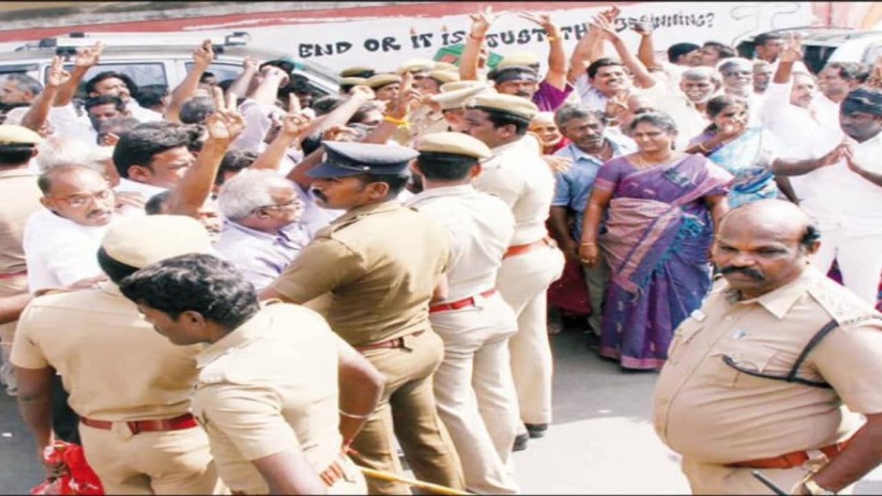 இதனையடுத்து மறியலில் ஈடுபட்ட 23 பெண்கள் உள்பட 105 பேரை காவலாளர்கள் கைது செய்து காவல் வாகனத்தில் ஏற்றினர்.